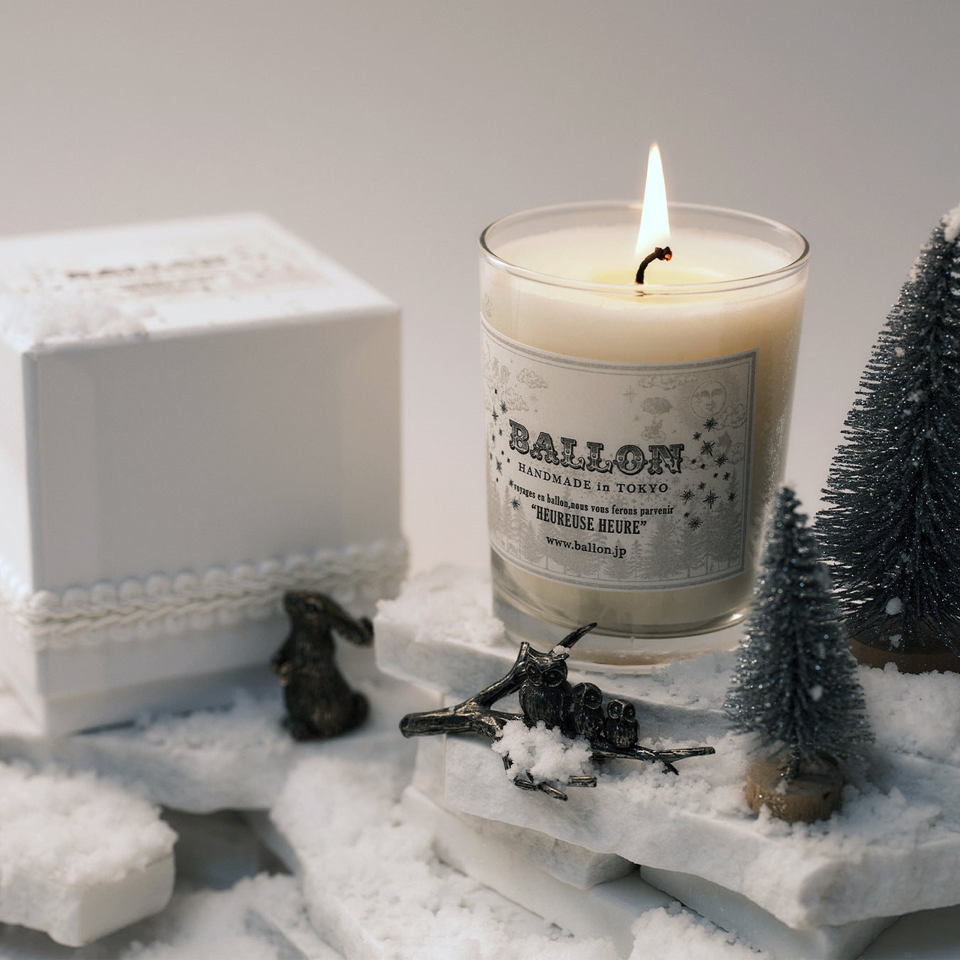 2023年限定デザインのアロマキャンドル。BALLONのクリスマステーマの香りであるWINTER FORESTの香りです。白のブレードつきのギフトボックス仕様。