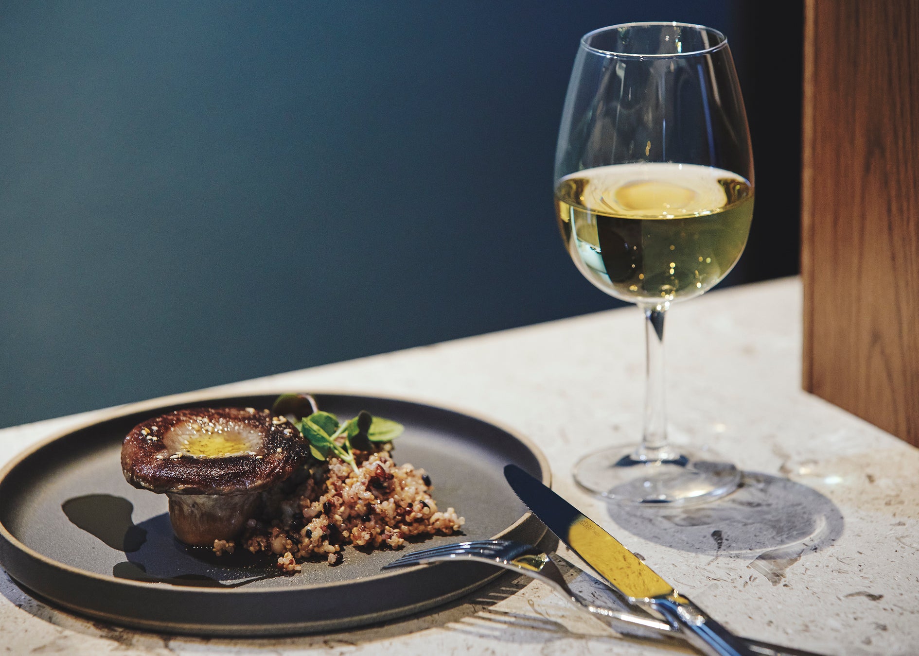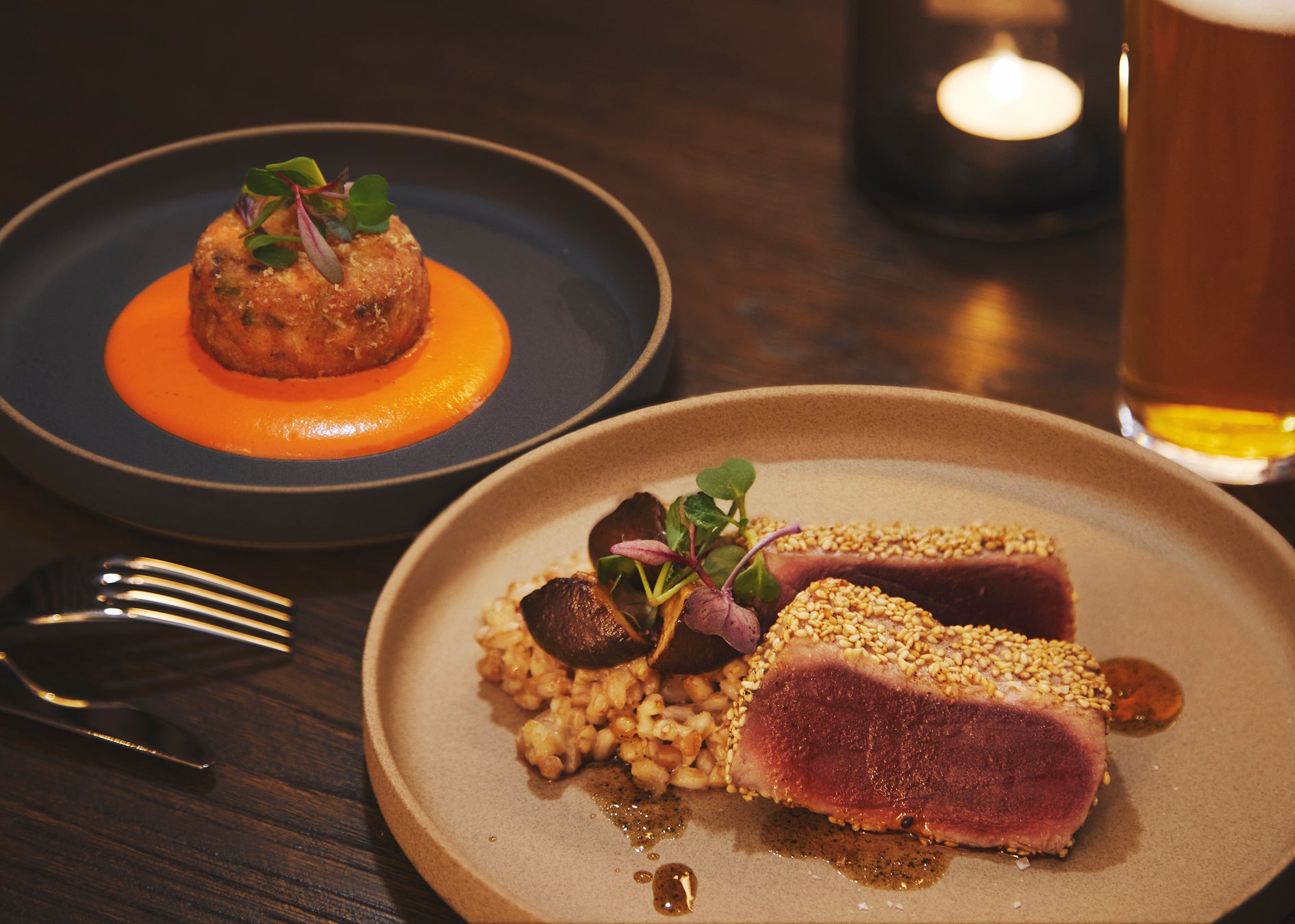 黒七味をアクセントにしたマグロのレアステーキに西京味噌でマリネしたアワビ茸、人気のアメリカ料理
