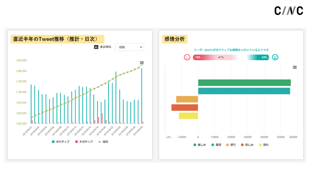 CINCが独自に開発した感情分析AIによって、ツイート(テキストデータ)の背景にあるユーザーの感情を表示します。
