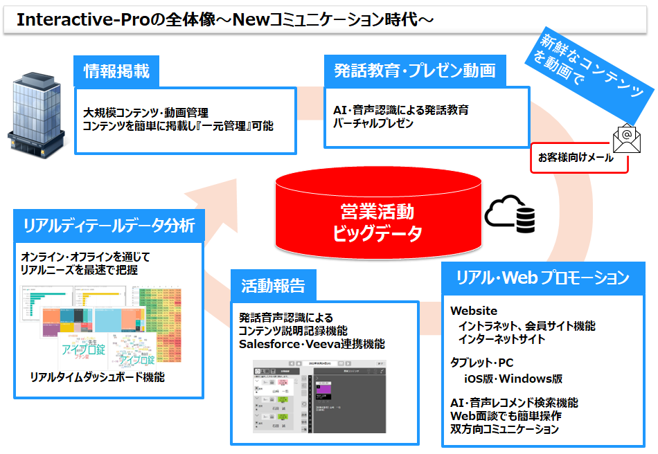 「営業活動がハイブリッドに大きく変化しました。このような大きな環境変化の中では、クライアントとの限られた面談時間の有効活用が求められると同時に、クライアントからの質問への即応性が営業活動を成功に導く鍵となります。私たちは、音声認識・AIでの教育データ利活用から営業活動ログであるビッグデータの解析まで、BIを用いたダッシュボードで一気通貫に解析するプラットフォームInteractive-Proを自社開発で提供しています。Interactive-Proで、営業部門の真のDX を実現してください。」