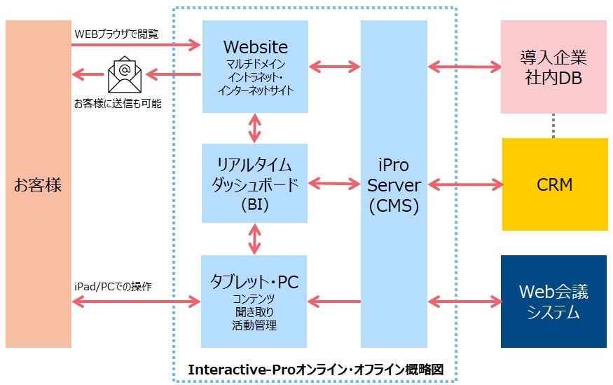 【開発背景】コロナ禍を経て、オンライン・オフライン混在のハイブリッド営業が浸透してきましたが、リアル面談や客先での会話などのオフライン営業活動は特にデータ化が難しく、ハイブリッド営業のオンライン・オフラインを一気通貫したデータ化・視覚化が大きな課題となっています。iProでは、「モバイルデータベース」「AI」「音声認識」などの保有特許(国内外70件)技術により、営業の現場で必要な資料や機能をタブレット・PCに集約、導入企業は、教育・資料検索・面談準備・メール・Web面談・リアル面談・聞き取り・報告などの営業活動の多くをログとしてリアルタイムに収集しています。新機能では、iProの数百種類のログ収集機能をフル活用し、オンライン・オフラインを問わないデータの統合・視覚化を可能としました。