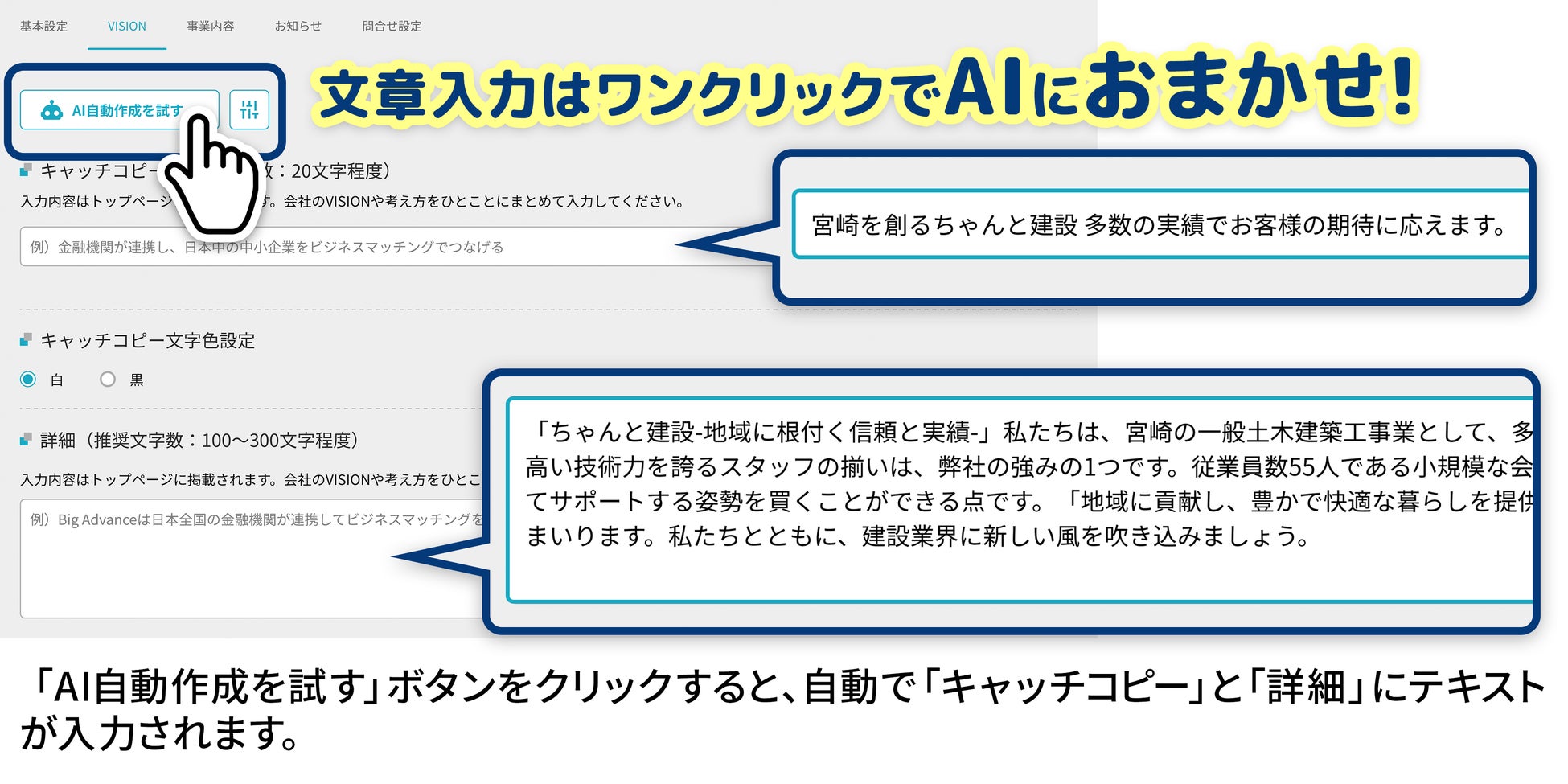 Big Advanceに登録されている企業情報を活用することにより、ボタン1つで、ホームページに記載する「キャッチコピー」や「詳細」情報を自動生成され、作成時間を大幅に短縮することが可能となります。なお、送信されるデータはモデルのトレーニングに使用されませんので、会員企業は安心して利用することができます。