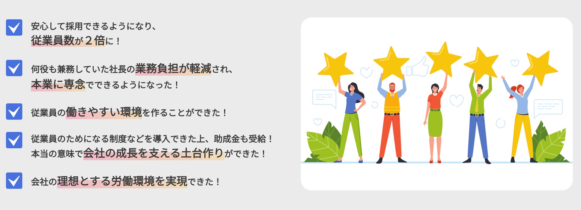 「助成金コーディネート」は、助成金を受給するだけでなく、助成金受給に向けたプロセスでしっかりと労務整備を行うことで、従業員が働きやすい理想的な労働環境を実現する点が特徴です。その結果として、採用力の向上や社員の定着、理想的な労働環境の実現などの効果を実感していただいています。リニューアル後のサービスサイトでは、導入効果や導入事例についても詳しく紹介しています。