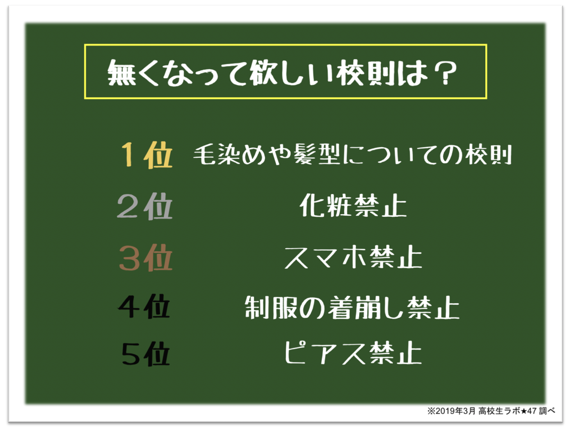 続いて、「化粧禁止」や、「スマホ禁止」「制服の着こなし方」に関する校則が続きました。
