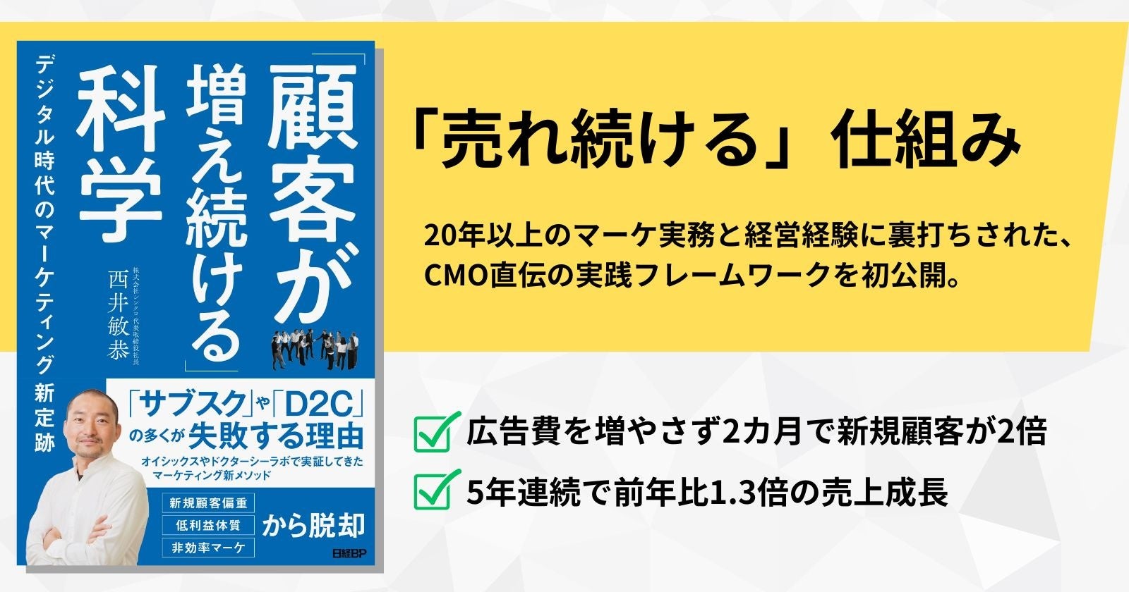 デジタル×マーケティング支援と事業開発を行う株式会社シンクロ(本社:東京都渋谷区)は、代表取締役社長である西井敏恭が新著「『顧客が増え続ける科学』 デジタル時代のマーケティング新定跡」を2025年6月20日に日経BPより出版することをお知らせします。