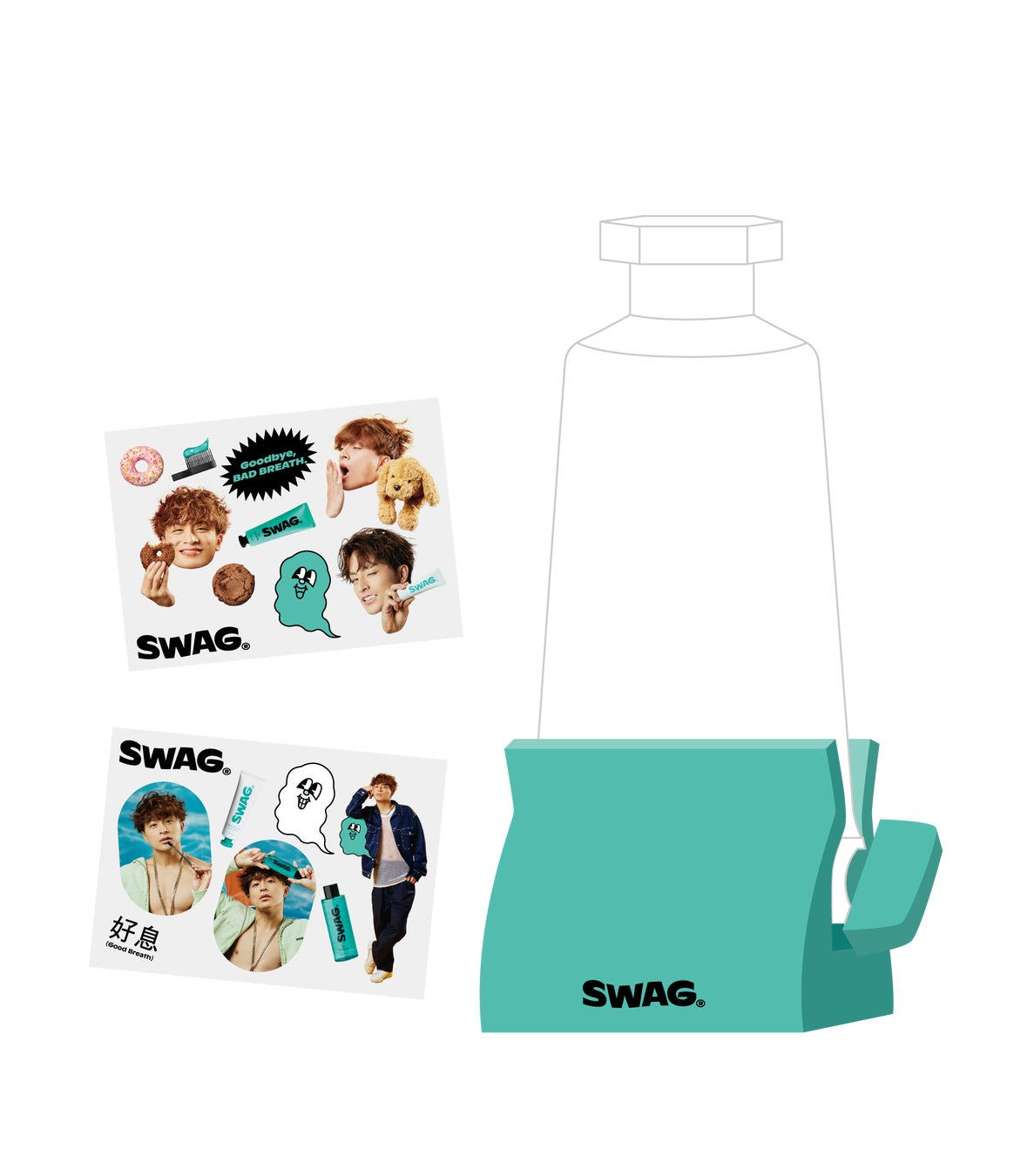 本キャンペーンでは、期間中に歯磨き粉を含む対象商品をご購入のうえ、公式LINEアカウントからご応募いただいた方の中から抽選で、SWAGオリジナル「Tube Squeezer(チューブスクイーザー)」と「デコレーションステッカーセット」をプレゼント。スタイリッシュなデザインで、ファン必見の限定アイテムです!