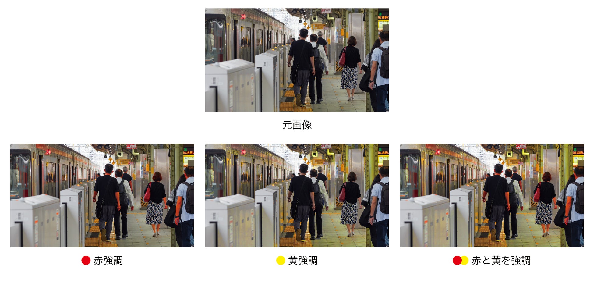 映像全体の見た目の影響を最小限に抑えながら、赤/黄それぞれのカラーを強調することが可能。点字ブロックや車側灯の視認性を高め、安全確認業務をサポートします。強調レベルは、赤/黄それぞれ3段階から選択可能です。