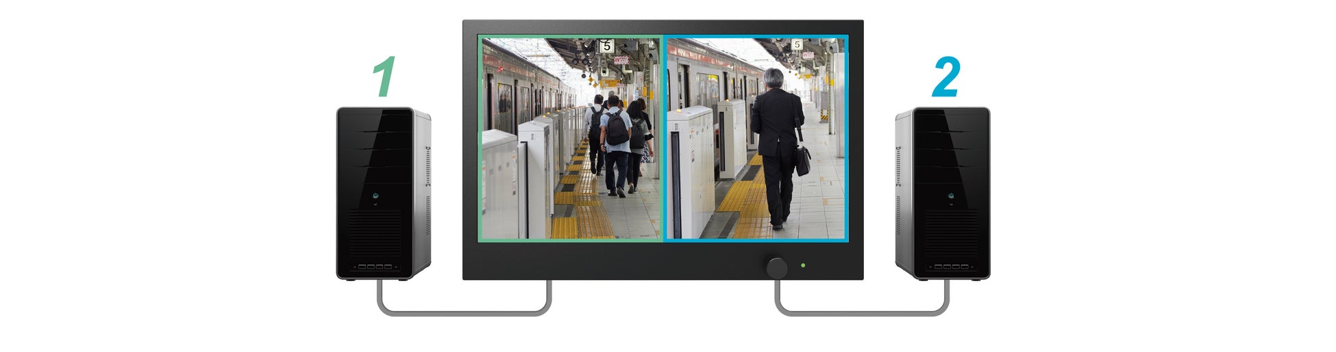 HDMI®入力端子を2系統、DisplayPort™入力端子を1系統搭載しており、2つの入力信号を1画面に並べて表示できるPbyP機能に対応しています。これにより、駅ホームの広範囲な映像を効率的に確認することができます。