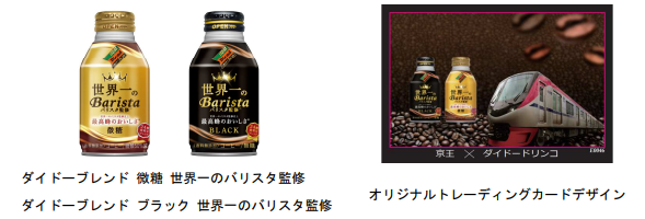 当日は、京王線新宿駅のイベントスペースにお立ち寄りいただいた方に、「ダイドーブレンド ブラック 世界一のバリスタ※1監修」もしくは「ダイドーブレンド 微糖 世界一のバリスタ監修※¹」のどちらか1本と、ダイドードリンコと京王電鉄がコラボしたオリジナルトレーディングカードを数量限定※²でプレゼントいたします。
