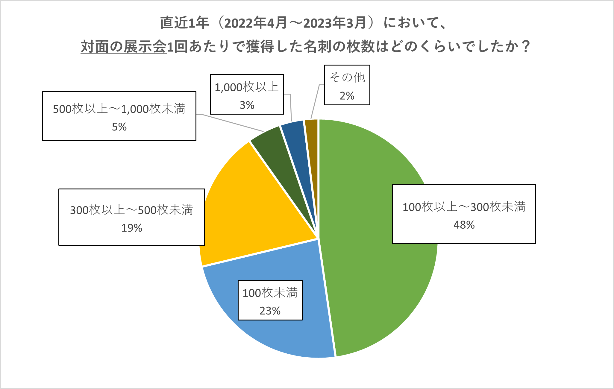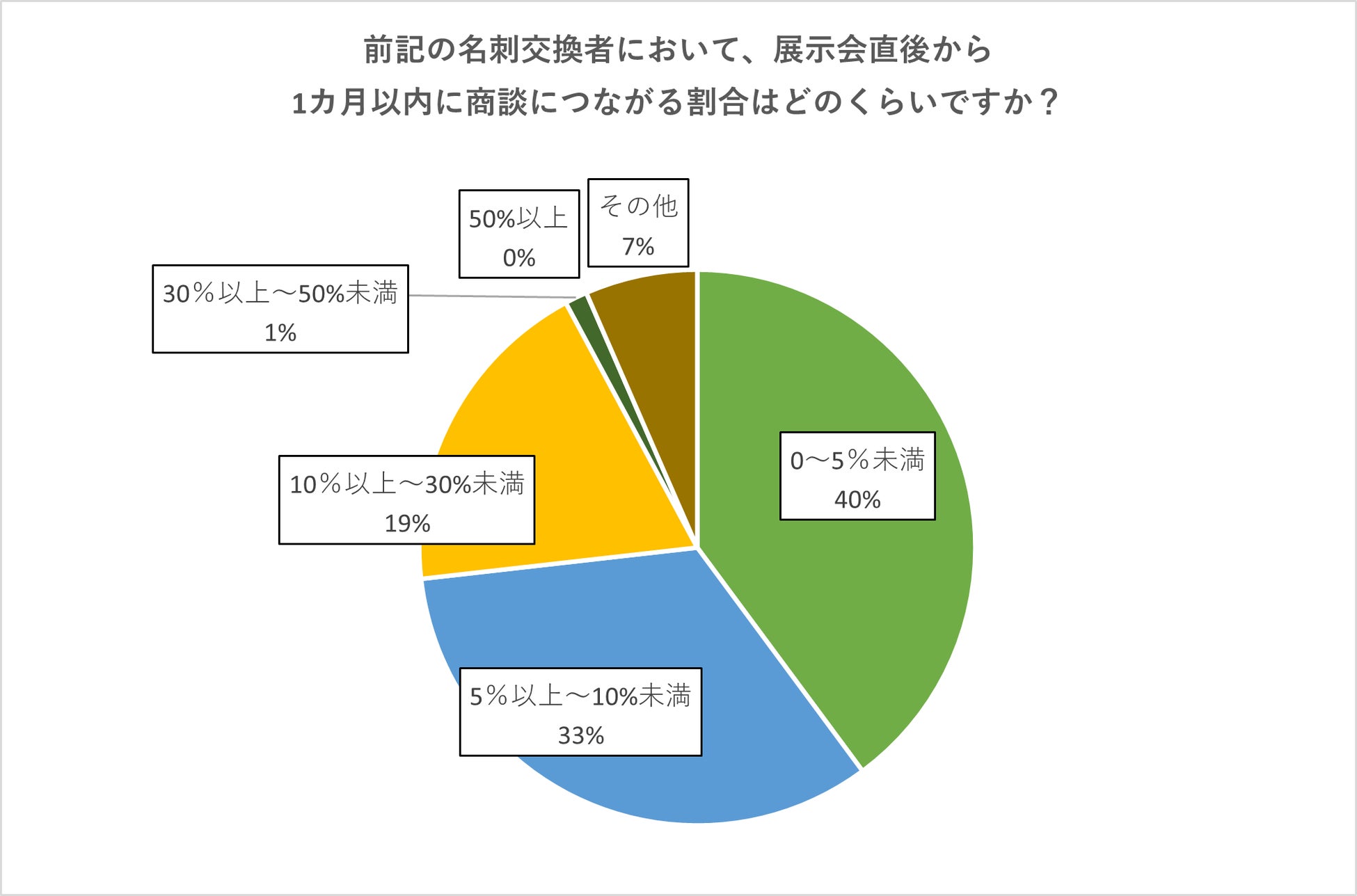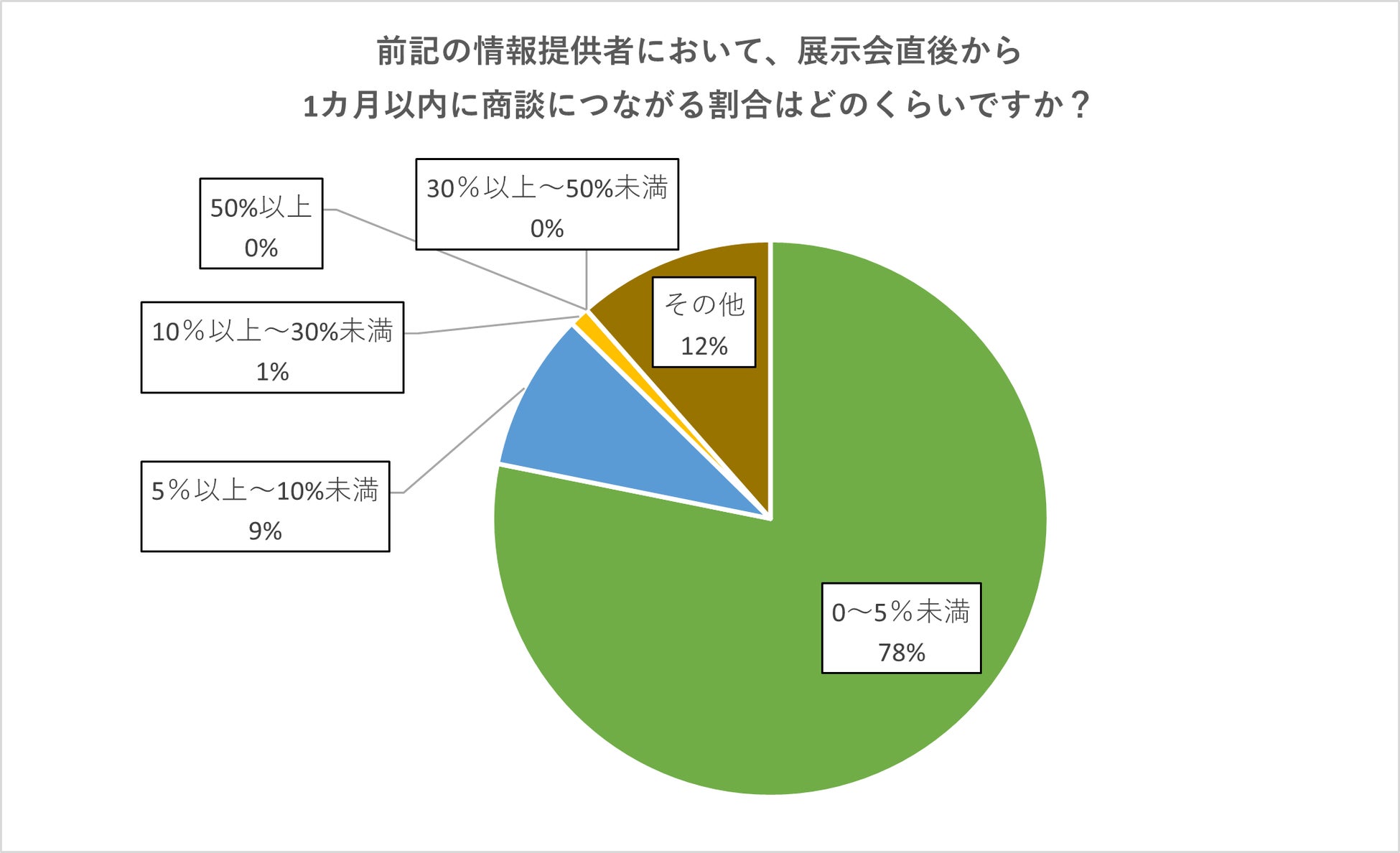 一方で、対面のリアル展示会1回あたりで獲得した名刺枚数は「100~300枚未満」が最も多く48%でした。その後1ヵ月以内に商談に繋がる割合も、「0~5%」という回答が最も多くはありますが、「5~10%未満」が33%、「10~30%未満」も19%となりました。名刺と顧客情報という違いはあるものの、オンラインと比較してリアル展示会の方が、顧客情報の獲得、そして商談に繋がる割合が高いといえそうです。