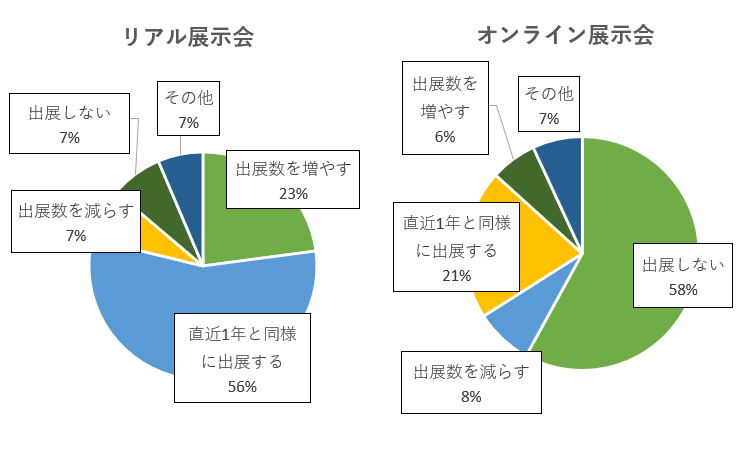 出展意向、リアル展示会「増やす・直近1年と変わらず出展」が79%、オンライン展示会「出展しない・減らす」が66%
