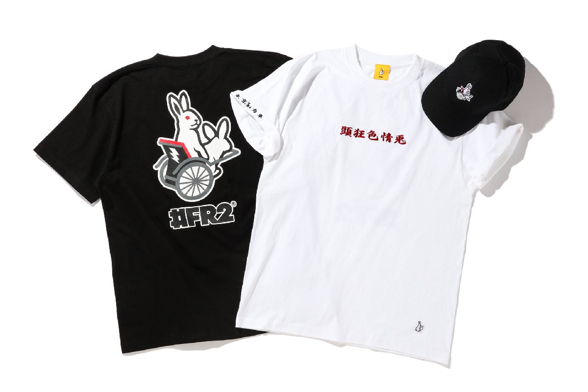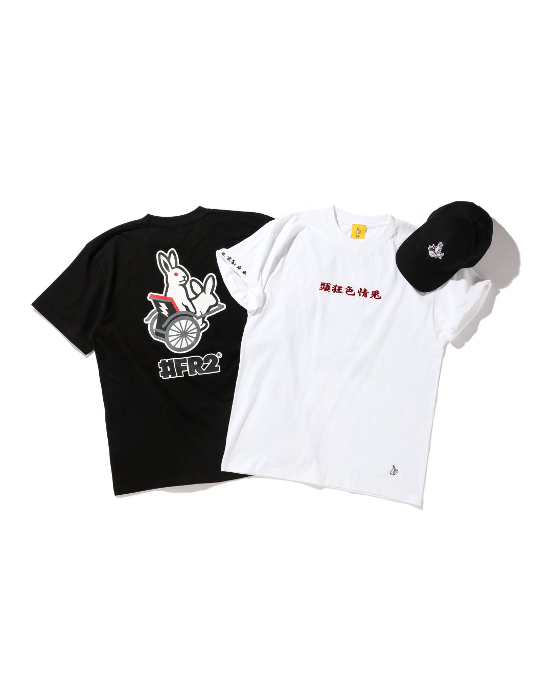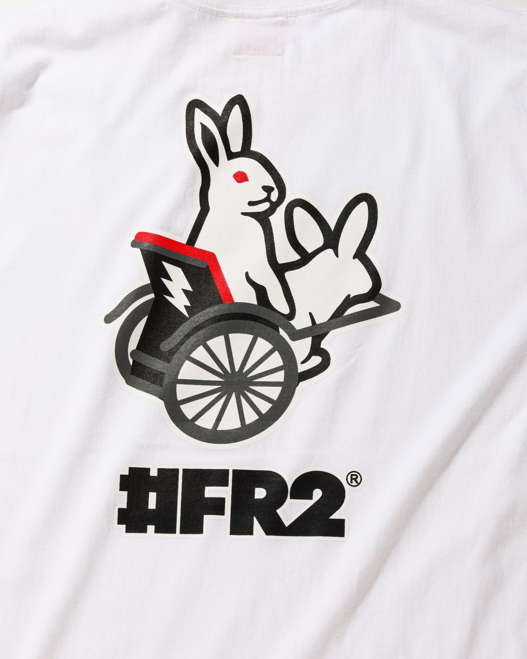 Tシャツは、フロントに「頭狂色情兎」ロゴを刺繍し、バックには「#FR2」の象徴であるウサギのアイコンと人力車を組み合わせた特別なグラフィックを配置。さらに、袖口を折り返すと、「東京力車」のロゴが現れる、遊び心の効いたディテールを加えています。カラーはホワイトとブラックの2色を展開。
