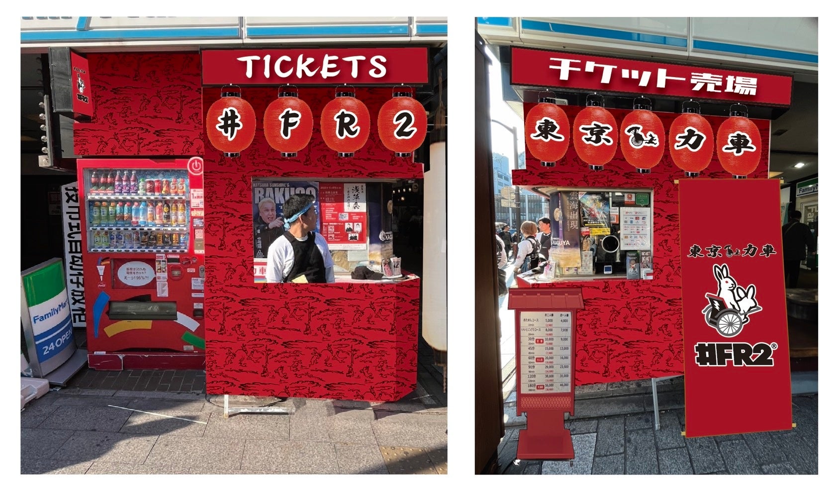 2025年7月5日(土)より、東京力車のチケット売り場(浅草タウンホテル1階)限定で発売いたします。販売期間中は、チケット売り場の外観を「#FR2」仕様に装飾し、東京力車のブランドカラーである赤を基調に、和柄のウサギやコラボロゴをあしらった特別な演出でお客さまをお迎えします。
