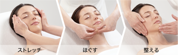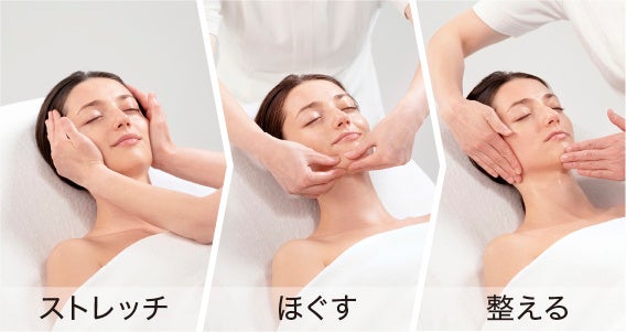 生理学に基づいてデコルテ・首から顔上部へと丁寧にケアする新テクニック。デコルテ・首・フェイスライン・ほほ・口もと・目もと・額など、顔のパーツ毎にストレッチして緩め、ほぐして整える工程を繰り返すことで、自然と顔全体が引きあがり、はつらつとした印象へと導きます。