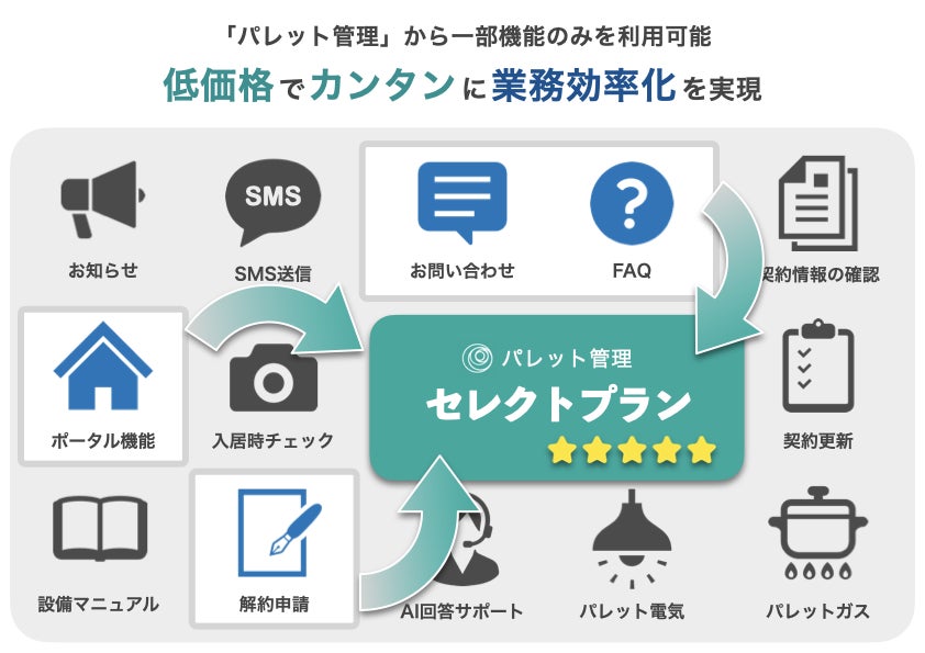 また「パレット管理 セレクトプラン(※2)」は、「パレット管理」から必要な機能だけを選んで簡単に低価格で導入利用できる、入居者専用サイト制作ツールです。