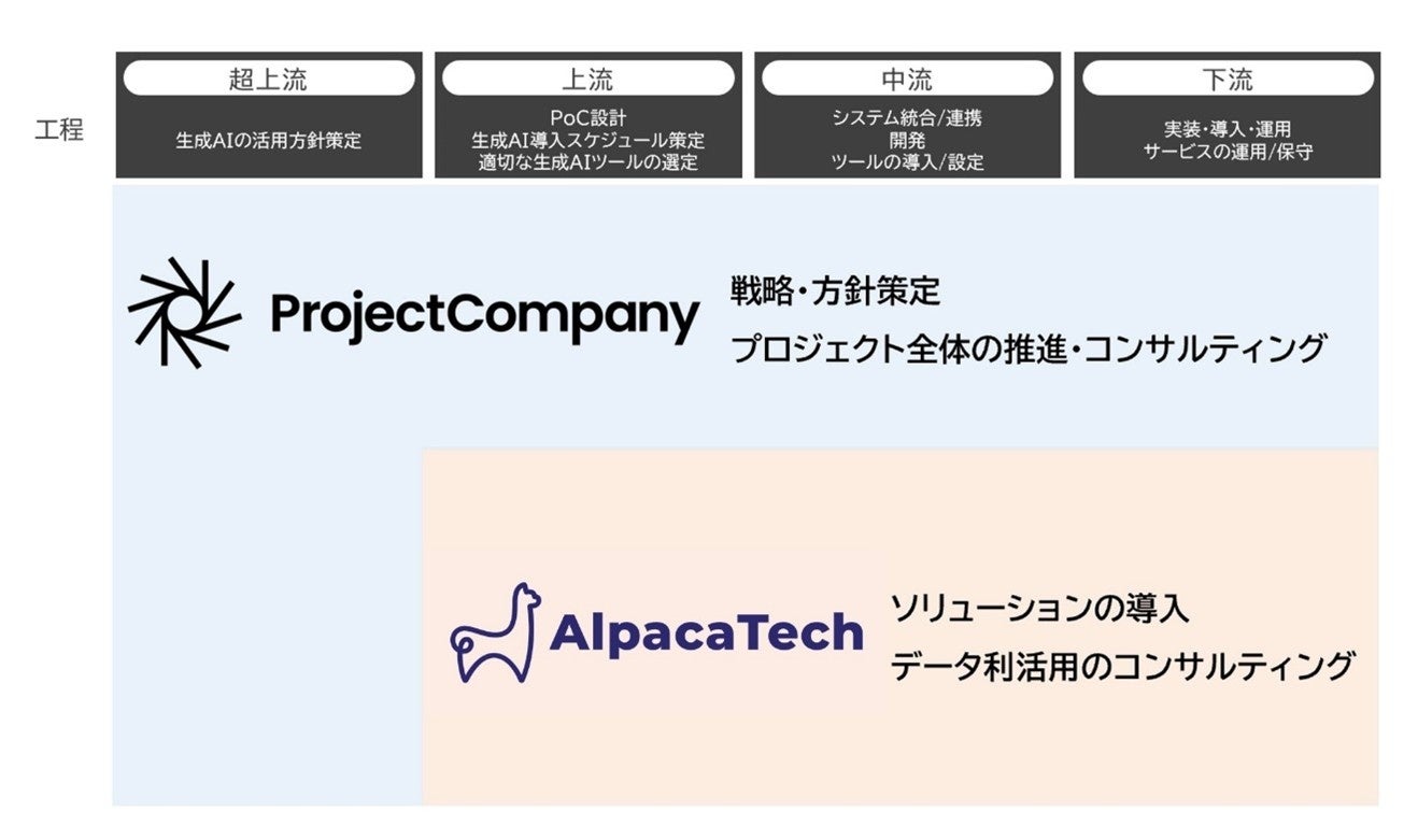 AI技術の発展によりビジネスシーンでのAI活用が急激に広まっている今、事業課題とデータに基づいて適切にAIを活用する能力が、企業の成功を左右する鍵となっています。AlpacaTechは、AIを駆使した革新的なソリューションの開発に精通しており、一方プロジェクトカンパニーはDX・AI領域におけるコンサルティングサービスを主業として手掛けています。