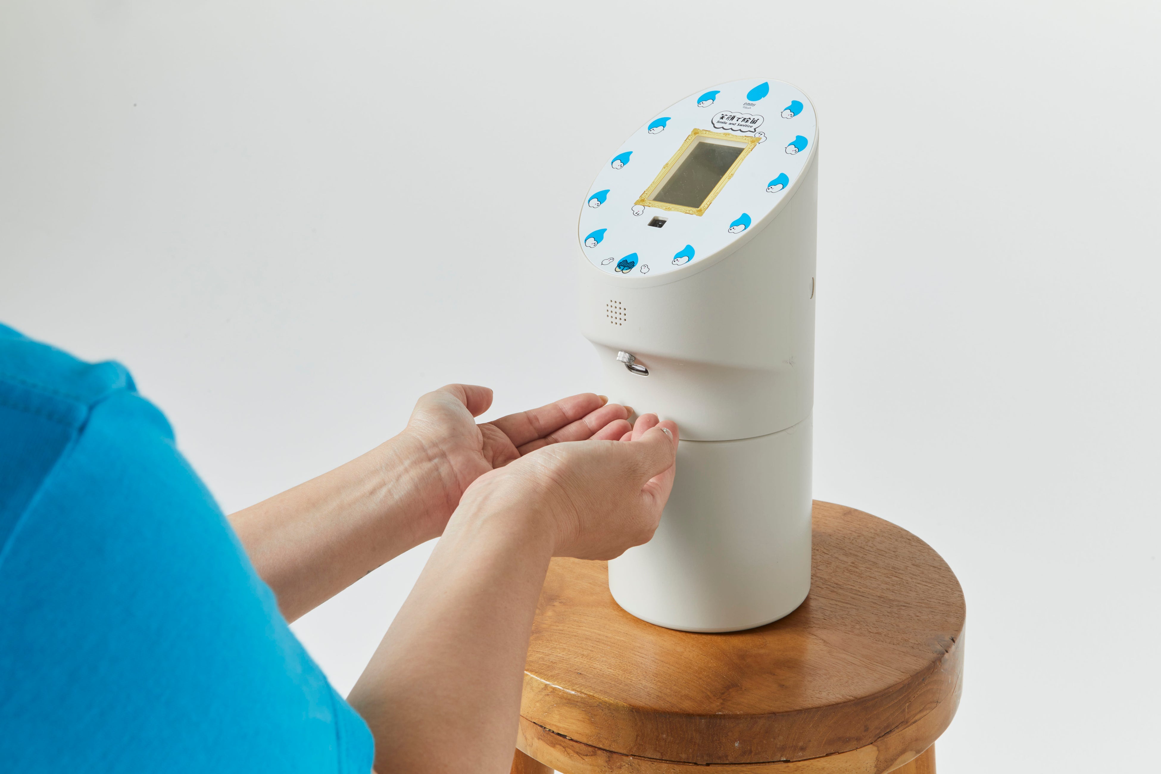 emmyWashは、笑顔を感知すると除菌液を噴霧する「社会装置」です。「社会装置」と呼んでいるのは、笑顔の回数を蓄積しており、笑顔数に応じてemmyWash本体が設置希望の学校等へ寄付する仕組みを組み込んでいるからです。