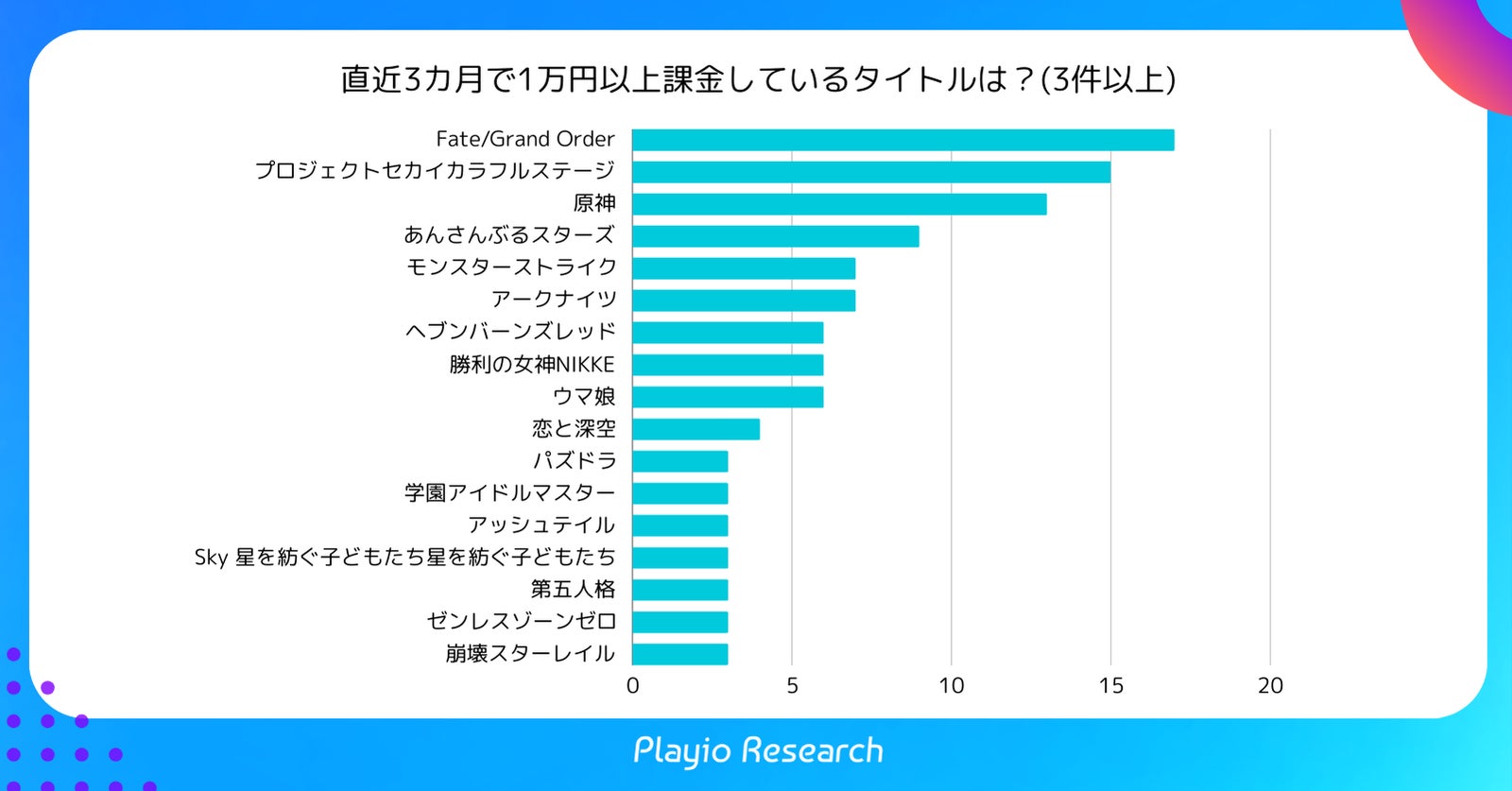 次に、直近3カ月で1万円以上課金しているタイトル名を調査したところ、上位から順に「Fate/Grand Order」「プロジェクトセカイ カラフルステージ! feat. 初音ミク」「原神」が並んだ。