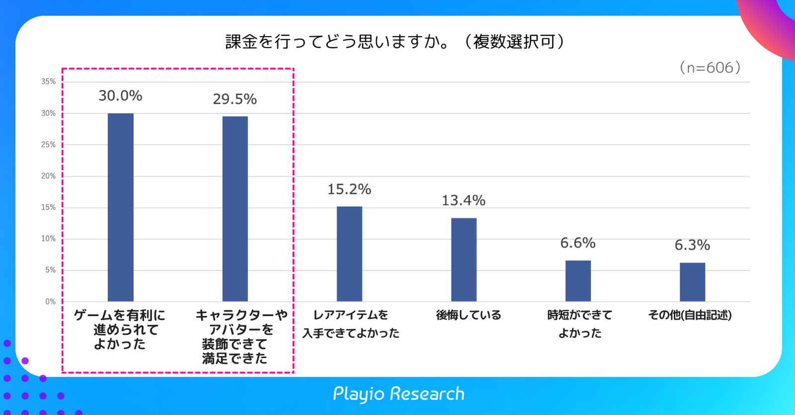 また課金をおこなった後の感想として、課金に「後悔している」が13.4%に対して、ゲームを有利に進められたりキャラクター・アバターを好みに装飾することができたなど、ポジティブ回答が上位に並んだ。
