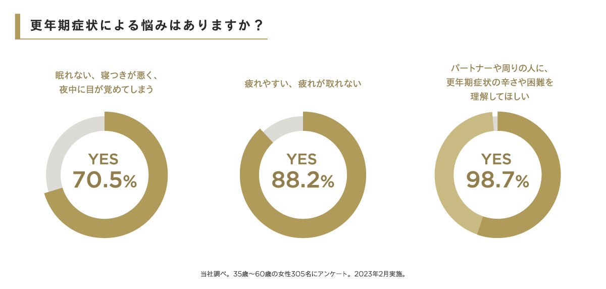 「眠れない、寝付きが悪い、目が覚めてしまう」、「疲れやすい、疲れが取れない」と答えた人も数多く、また、実に98.7%もの女性が、「パートナーや周りの人に更年期症状の辛さ・困難さを理解してほしい」と回答。