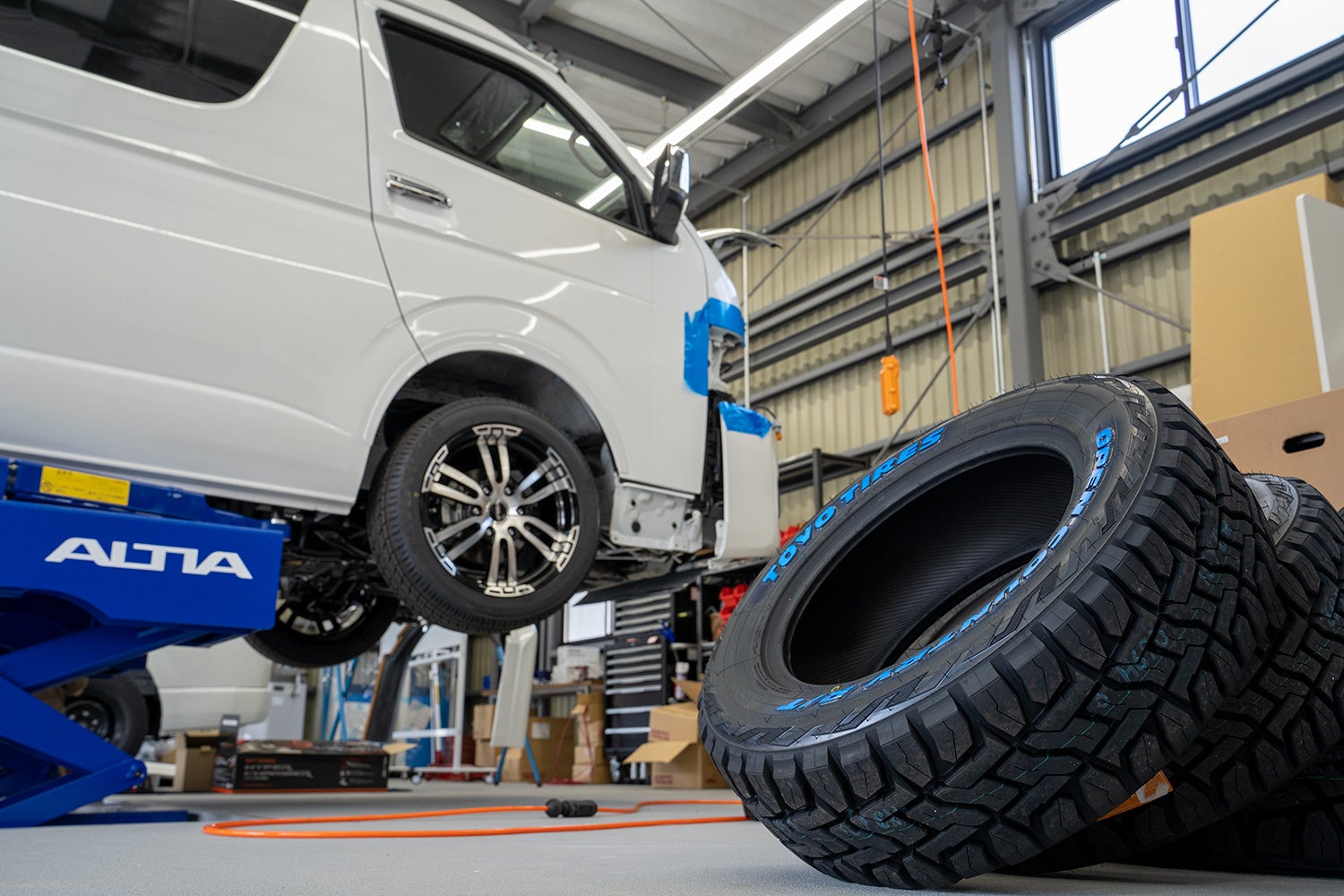 ハイエースベース柏では大人気のホイールやLEDランプなど、フレックスオリジナルのカスタムパーツはもちろんのこと、エクステリア、インテリアの各種パーツなど約3,000点以上のパーツを常備していますので、実際に見て、手に取って選んで頂くことが可能です。「こういうイメージに仕上げたい」「車内を快適にしたい」など、何でもお気軽にご相談ください。パーツショップのみのご利用ももちろん大歓迎です!認証工場を併設しておりますので、ハイエースのご購入相談から、ご納車後のメンテナンスまでトータルサポートが可能です。