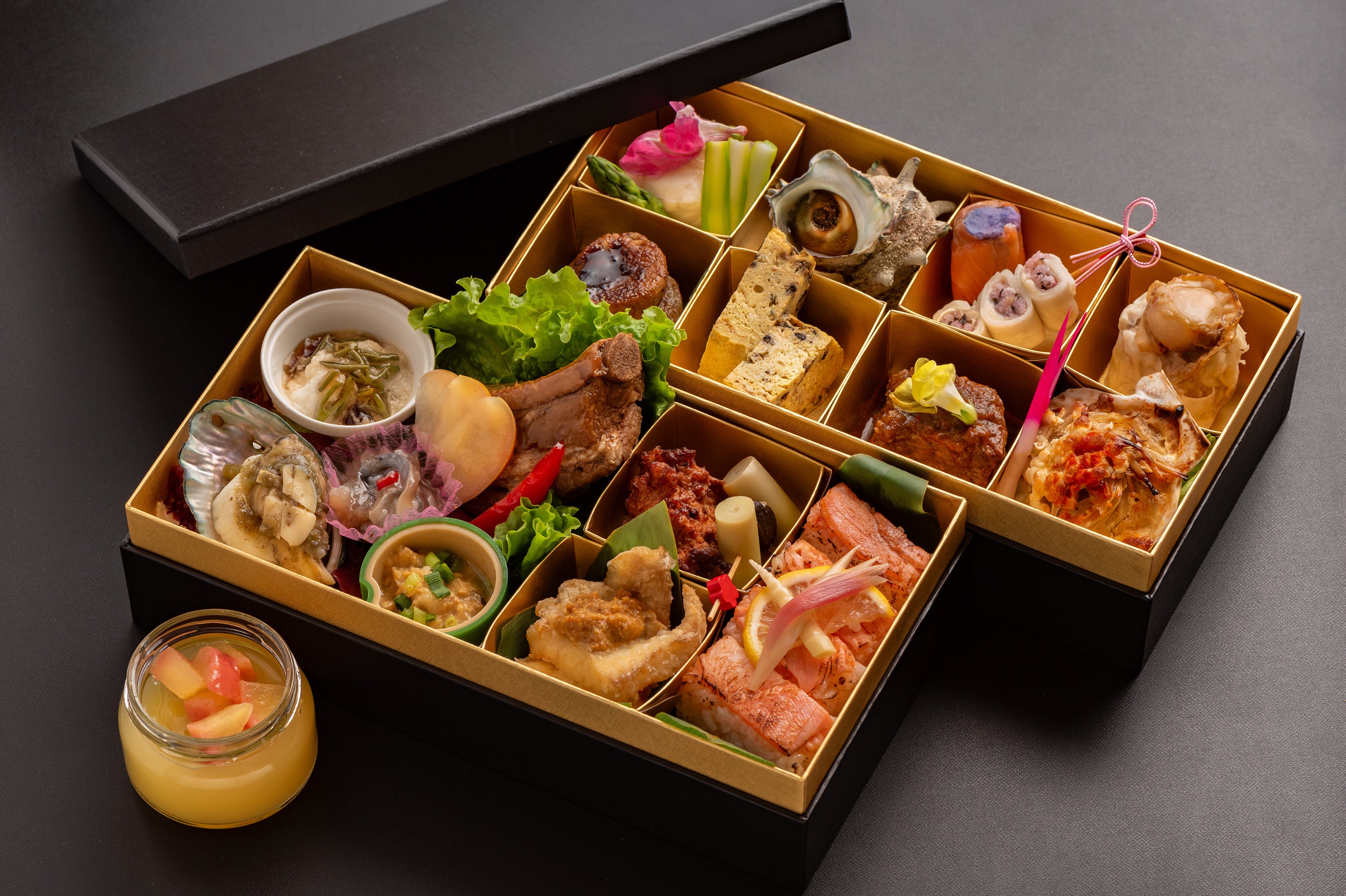 白神山地や津軽海峡をはじめ、自然豊かな青森県ならではの、四季折々の旬の食材を惜しみなく使用したお重形式での料理をご用意いたします。お飲み物は、飲み放題メニューの他、お席にシャンパンと青森の夏にちなんだ希少な地酒のボトルが付属しております。ねぶたと合わせて、青森県産の食材、そして地元のお酒が織りなす美食の世界をぜひご堪能ください。