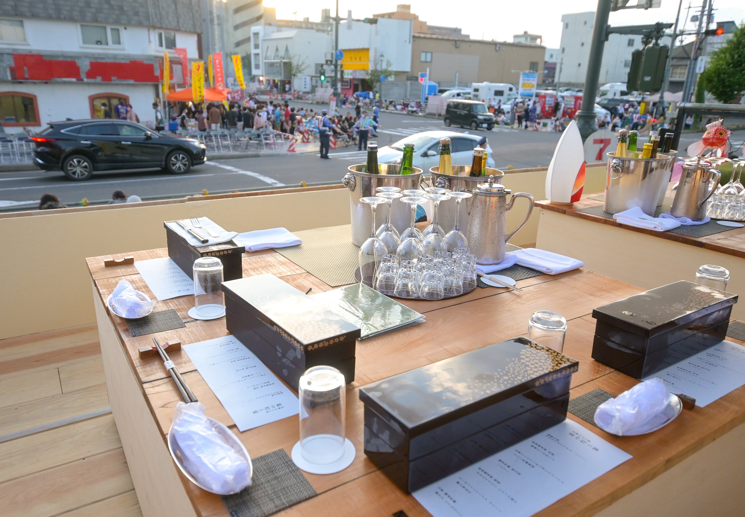 4年ぶりの通常開催となる今回!そして昨年の初実施後にいただきました多くの反響やご好評にお応えし、本年度は100万円のVIPシートの席数を増加してのご提供となります。また、全コースの中でも最も間近に「ねぶた」を楽しめる、ホテル青森のある新町通りから国道4号線を繋ぐ平和公園通りの沿道一面を会場に、ゆったりと過ごせる特別スペースをご用意しました。プレミアム観覧席ならではの特別な空間で、洗練された空間演出と厳選された青森のお酒と食材による豪華なお料理、そしてねぶた文化を継ぐ担い手の想いに触れながら観る特別な観覧体験をご提供致します。