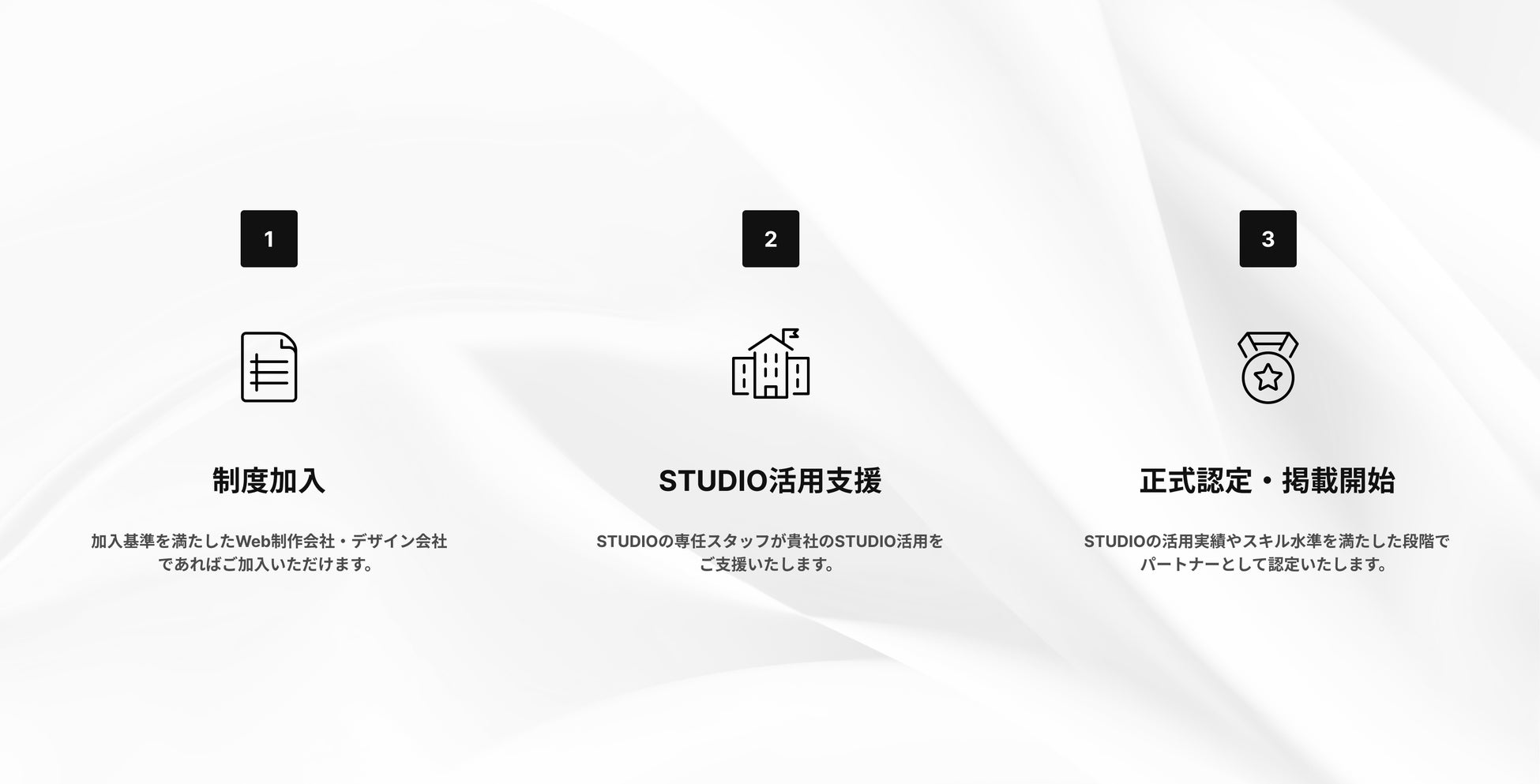 制度加入後は、弊社からSTUDIO制作に関するサポートを行うことで、貴社のノーコードWeb制作事業への参入をご支援いたします。その後、一定のSTUDIO制作実績を満たしていただくことにより、正式な認定パートナーとしてご活躍いただけます。