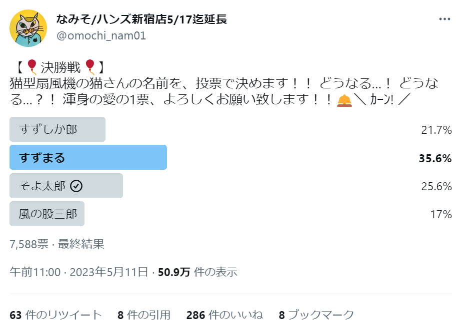 このねこ型扇風機の「すずまる」というお名前は、なみそさんのTwitterでお名前コンテストを実施し決定しました。