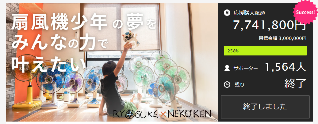 バラエティー番組やワイドショーなど多くのメディアに取り上げられ、1,564名のサポーター様より約770万円のご支援を受け、7月18日(火)、プロジェクトは大成功で幕を閉じました。