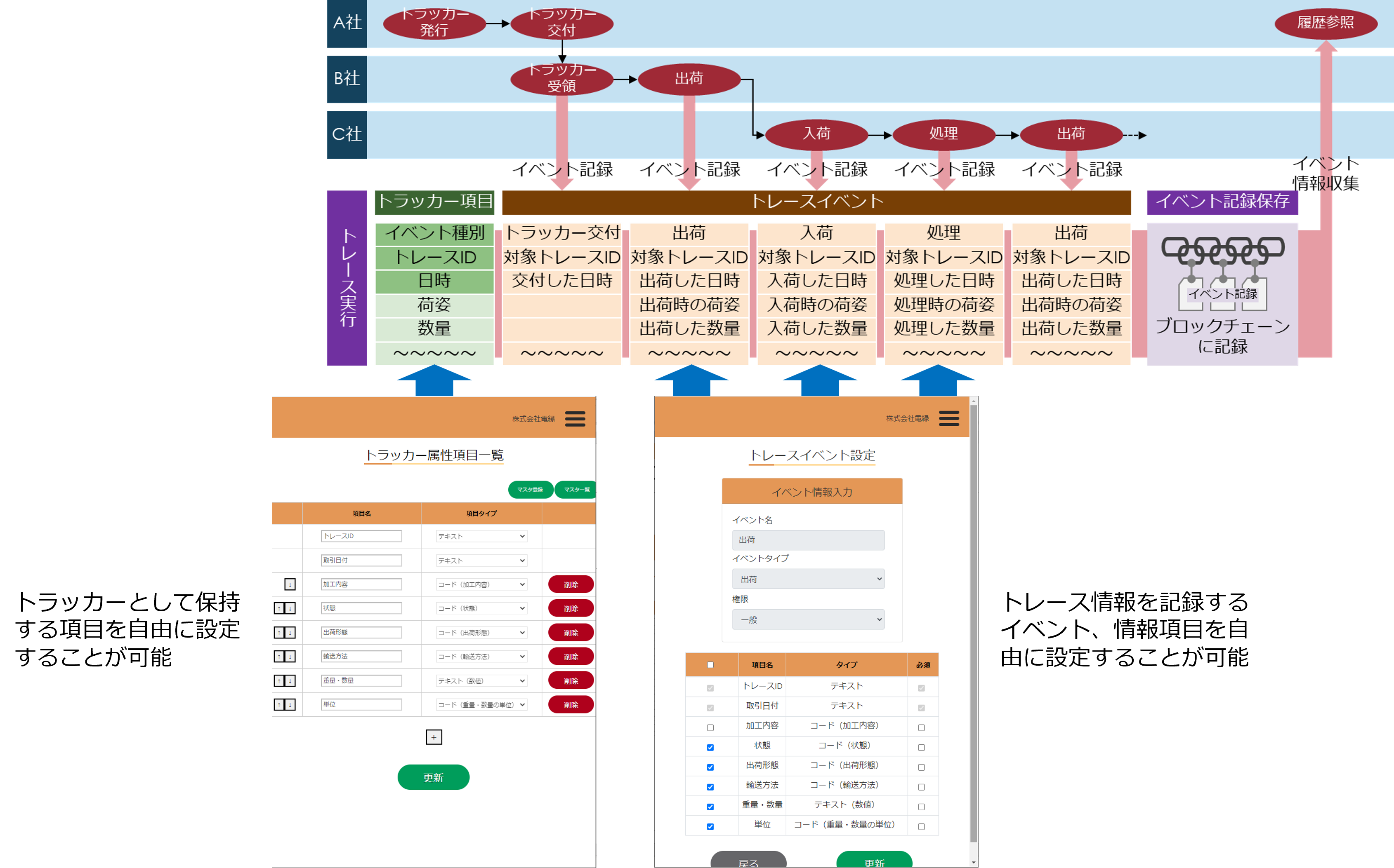 ブランド農水産物の産地偽装の抑止、生鮮食品の適切な輸送の証明、工業製品の原料から消費までの追跡、組織をまたがる業務の状態や受渡の管理(ワークフロー)などに使用することが考えられます。