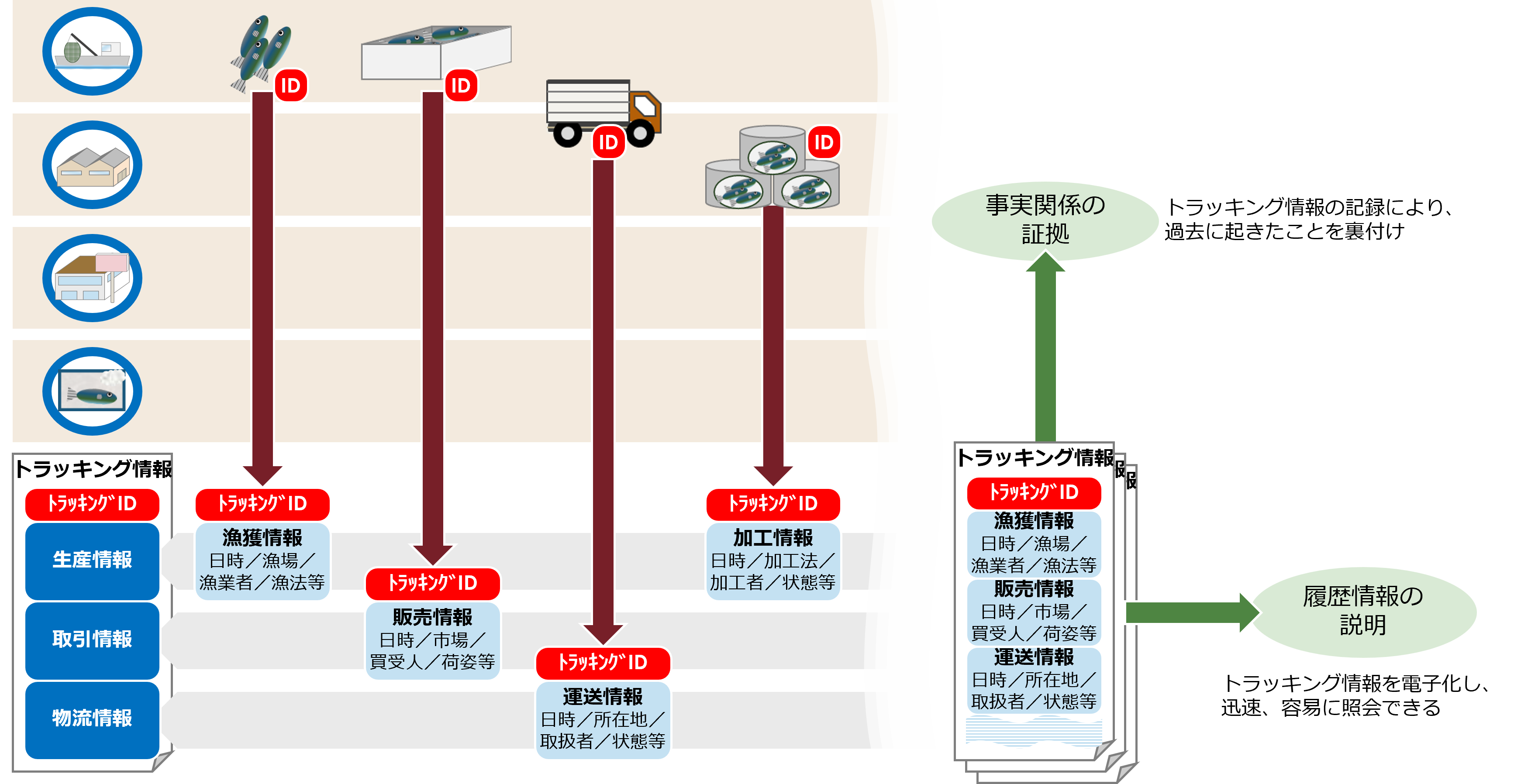 昨今頻繁に聞かれる農水産物の産地偽装に対する抑止策として、トレーサビリティで生産、流通情報を記録し、照合可能にすることで、記録が残っている正規品であるかを確認することができる仕組みを構築しています。
