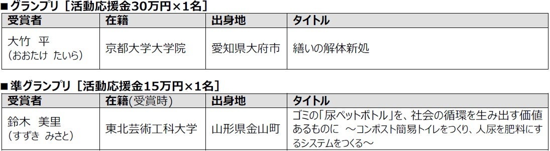 グランプリは大竹平さん(京都大学大学院)、準グランプリに鈴木美里さん(東北芸術工科大学)