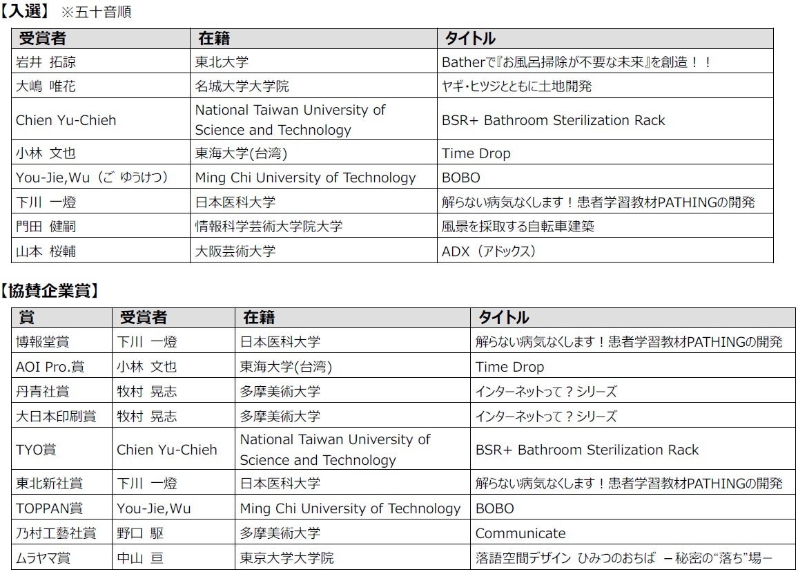 また、二次審査進出とはならなかったものの、優秀だった8名の作品を入選として表彰。この他、JIDF協賛各社の独自選考による協賛企業賞が選出されました。