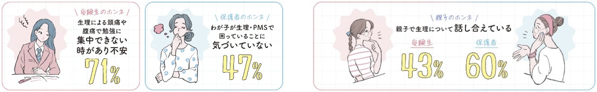 その結果、女子学生の71%が「生理による頭痛や腹痛が原因で勉強に集中できない不安を抱えている」と回答する一方、母親の47%が「娘が生理で困っていることに気づいていない」ことが分かりました。