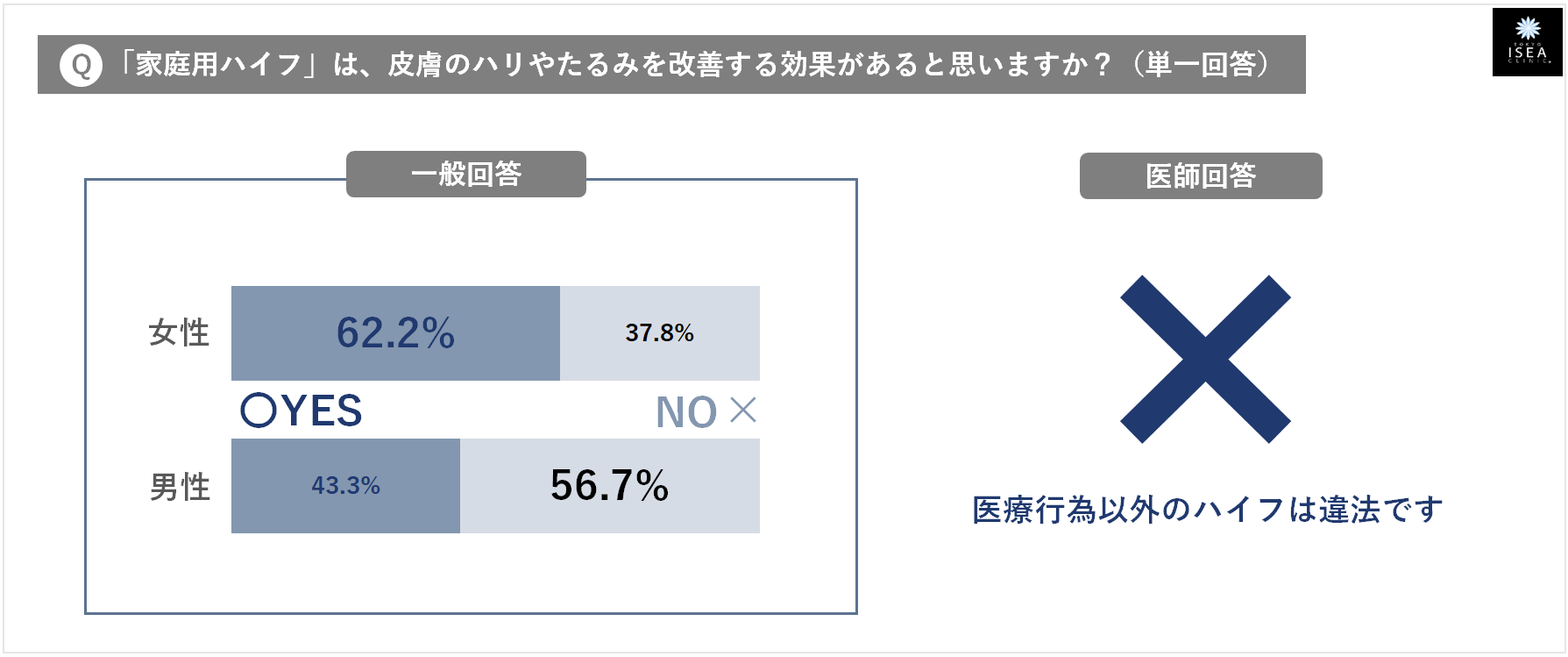 - ⑦『「家庭用ハイフ」は、ハリやたるみを改善する』・・・ 一般回答:そう思う(男性43.3%・女性62.2%) ⇒ 医師のホンネ:✕ (「ハイフ」は皮下組織や筋層に超音波を照射する「医療行為」。それ以外のハイフは違法です)
