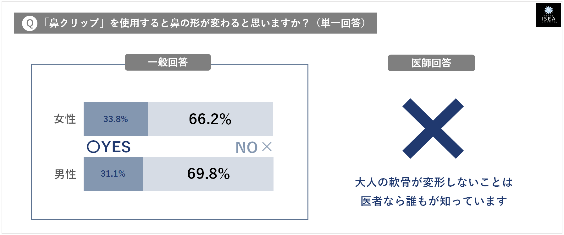 - ⑥『「鼻クリップ」を使うと、鼻の形が変わる』・・・ 一般回答:そう思わない(男性69.8%・女性66.2%) ⇒ 医師のホンネ:✕ (大人の軟骨が変形しないことは、医者なら誰もが知っています)