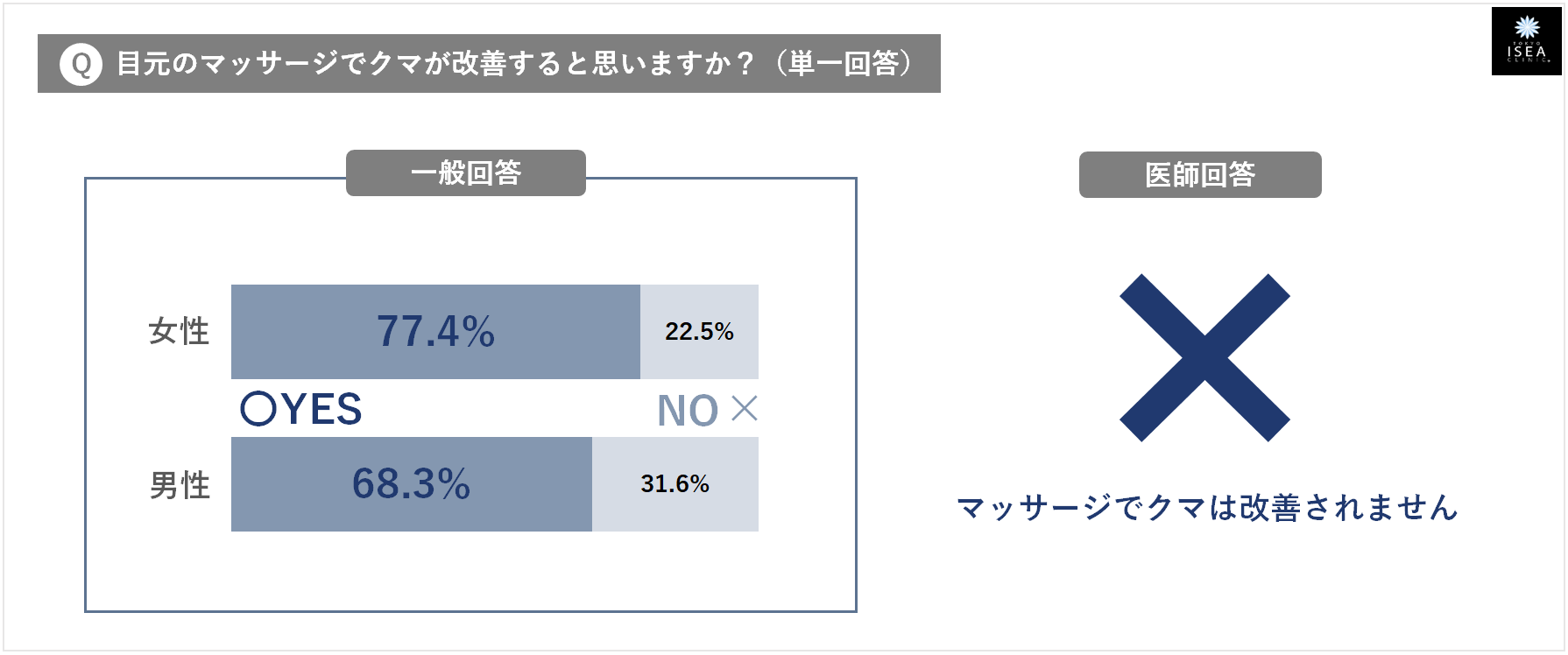 - ③『目元のマッサージで、クマが改善する』・・・ 一般回答:そう思う(男性68.3%・女性77.4%) ⇒ 医師のホンネ:✕ (目元のマッサージで、クマは改善されません)