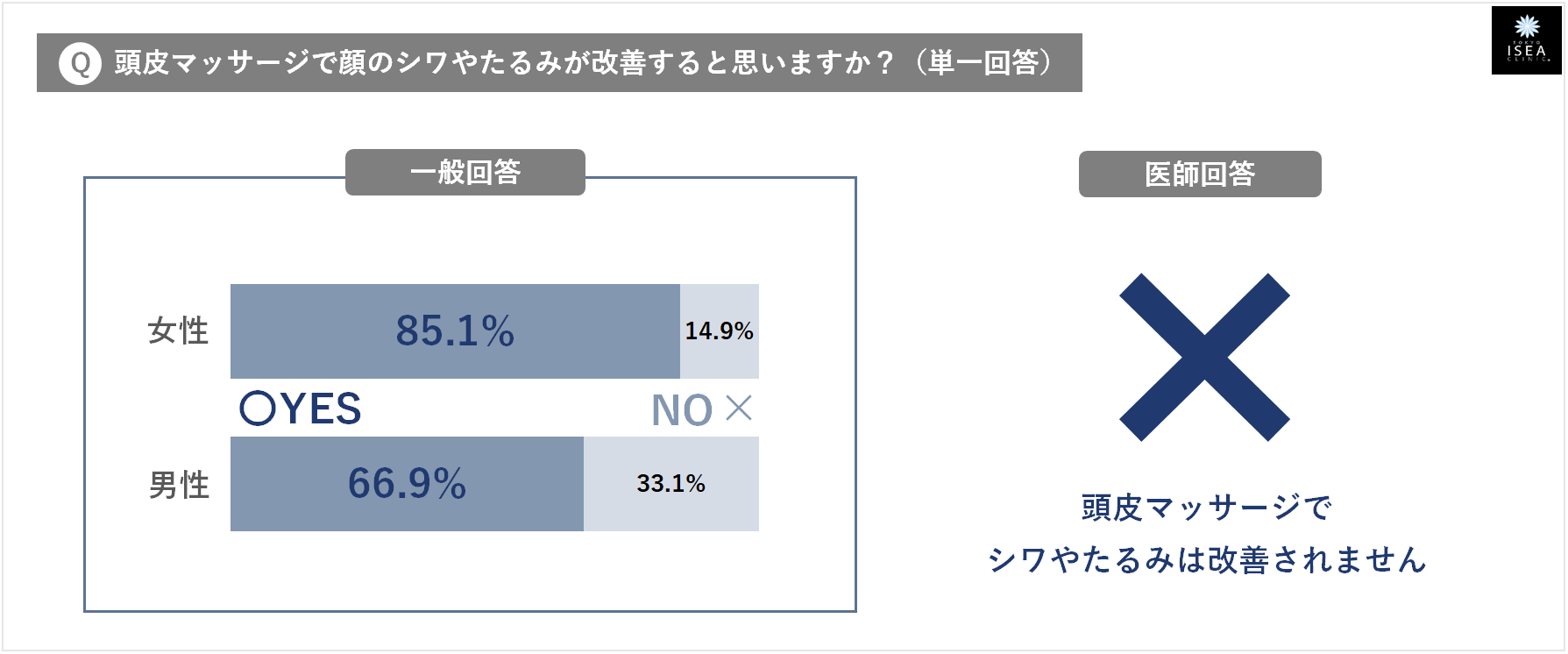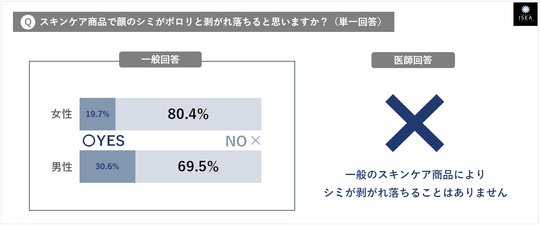 - ⑨『スキンケア商品でシミがポロリと剥がれ落ちる』・・・ 一般回答:そう思わない(男性69.5%・女性80.4%) ⇒ 医師のホンネ:✕ (一般のスキンケア商品によって、シミがポロリと剥がれ落ちるようなことはありません)