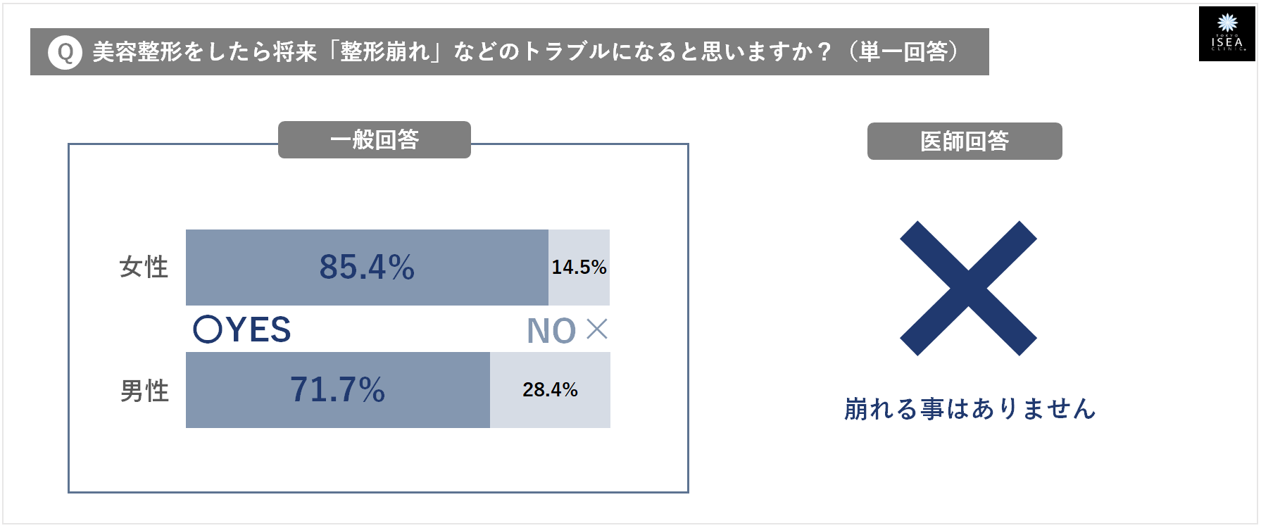 - ⑩【整形をしたら、将来「整形崩れ」などのトラブルになる】・・・ 一般回答:そう思う(男性71.7%・女性85.4%) ⇒ 医師のホンネ:✕ (適切な施術を正しく行えば、崩れることはありません)