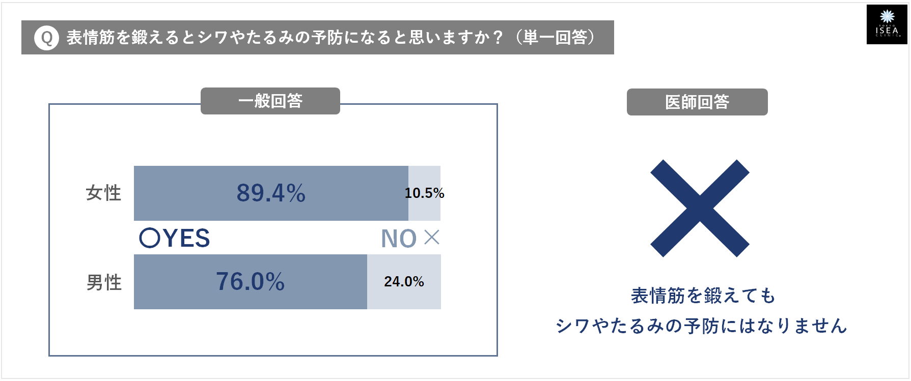 - ④『表情筋を鍛えるとシワやたるみの予防になる』・・・ 一般回答:そう思う(男性76.0%・女性89.4%) ⇒ 医師のホンネ:✕ (表情筋を鍛えても、シワやたるみの予防にはなりません)