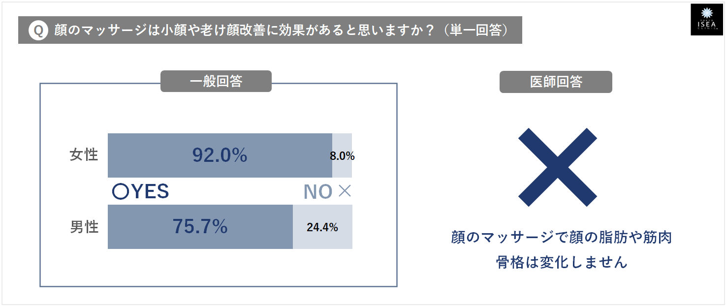- ①『顔のマッサージは、小顔や老け顔改善に効果がある』・・・ 一般回答:そう思う(男性75.7%・女性92.0%) ⇒ 医師のホンネ:✕ (顔のマッサージで、顔の脂肪や筋肉・骨格は変化しません)
