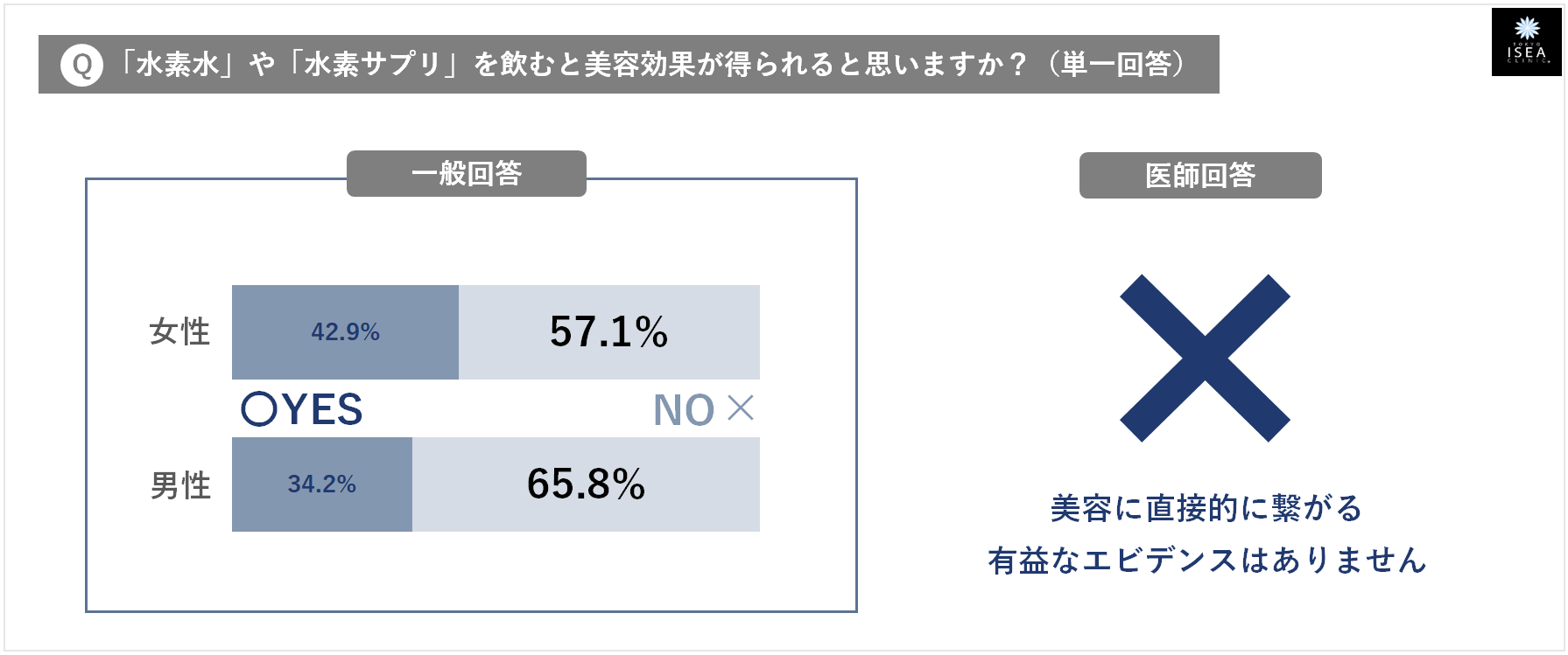 - ⑤『水素水や水素サプリを飲むと美容効果が得られる』・・・ 一般回答:そう思わない(男性65.8%・女性57.1%) ⇒ 医師のホンネ:✕ (美容に直接的に繋がる有益なエビデンスはありません)