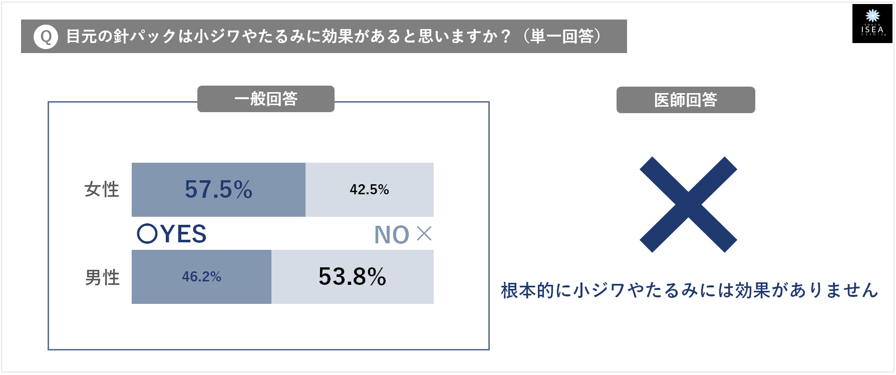 - ➇『目元の針パックは、小ジワやたるみに効果がある』・・・ 一般回答:そう思う(男性46.2%・女性57.5%) ⇒ 医師のホンネ:✕ (根本的に小ジワやたるみには効果がありません)