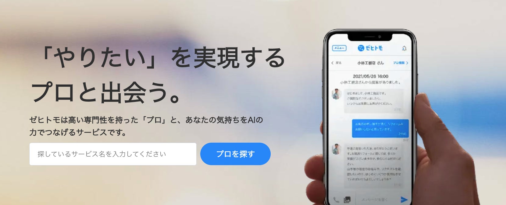 ゼヒトモは、仕事をお願いしたい依頼者と、カメラマン、ヨガ講師、リフォームや工事事業者など様々な「プロ」をつなぐプラットフォームです。依頼者には、毎日の生活をサポートするものから今まで利用しようと考えたことがないような便利なサービスまで提供し、またプロには仕事の幅や可能性を広げ、日本のローカルサービス、そして働き方を変えていきます。