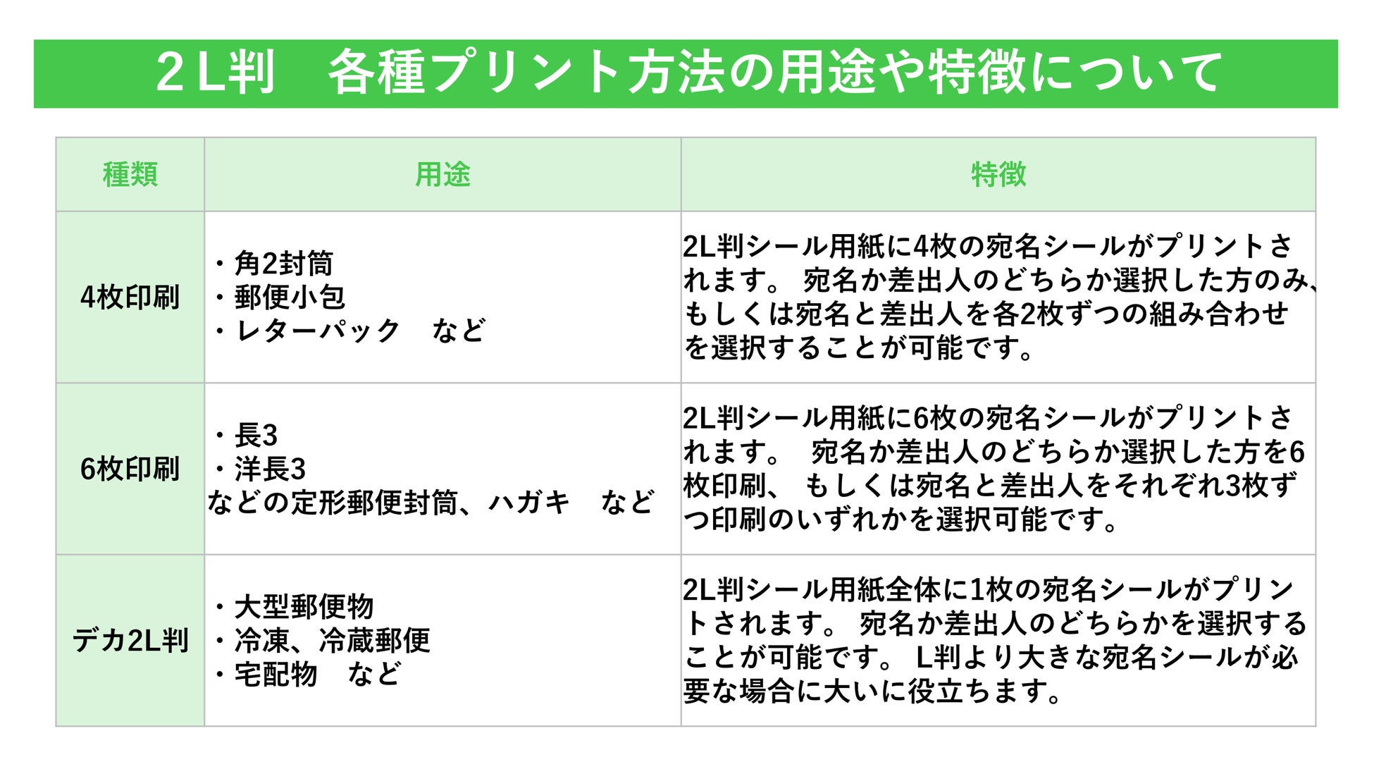 2L判シール(178mm×127mm)では、3種類のプリント方法から選択可能です。1枚500円です。