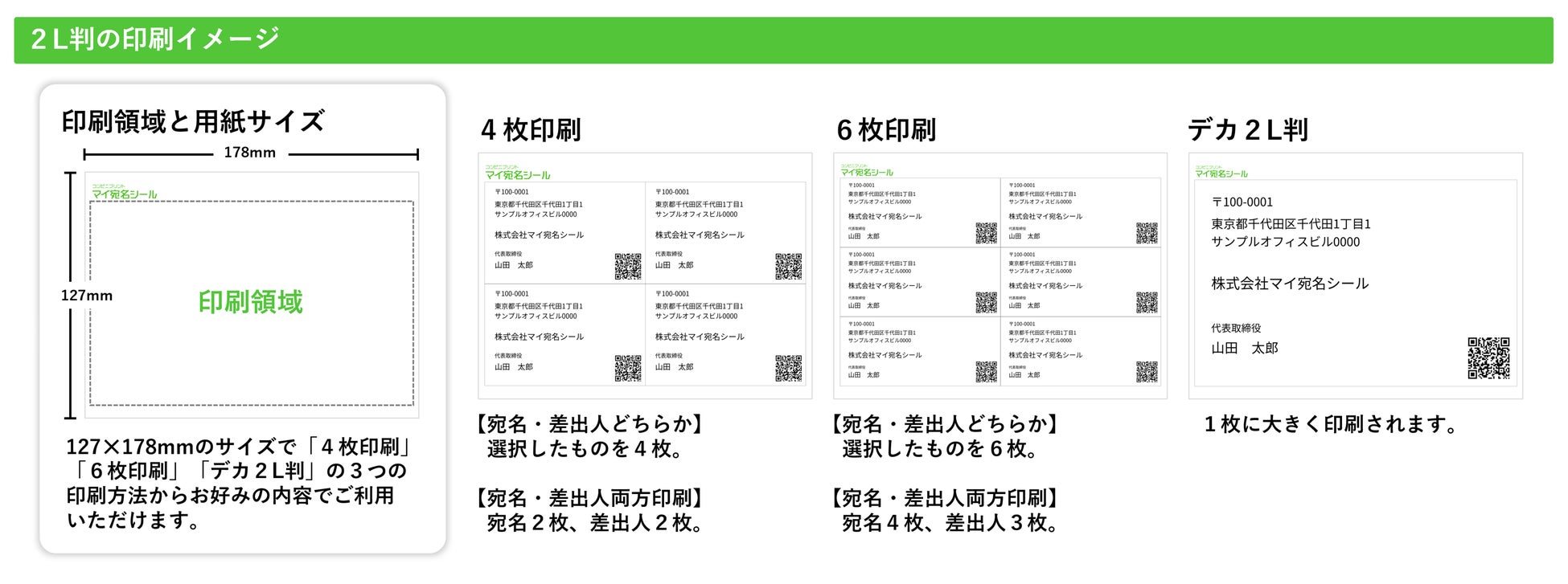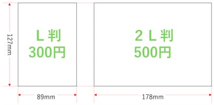 プリントできるシール用紙は2種類、L判(127mm×89mm)、2L判(178mm×127mm)です。