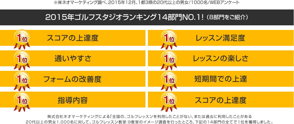 「5ラウンド以内にスコア100が切れなければ全額返金」というユニークな独自サービスを展開しており、1,000人による意向調査で、ゴルフスタジオランキング14部門でNo.1に輝いた(※)ゴルフレッスンスクールです。