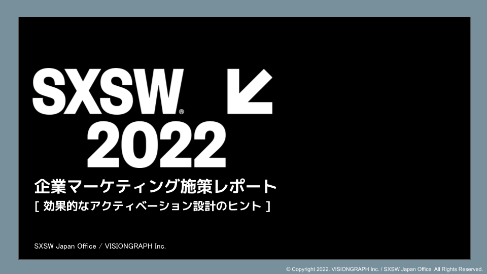 リアルとオンラインを組み合わせた初のハイブリッド開催となったSXSW2022。SXSW日本事務局を担うVISIONGRAPH Inc.は、日本の皆さんに向けて【企業マーケティング施策レポート】と【SXSW2022から読み解く未来の兆し】の2つのレポートを無料で公開します。