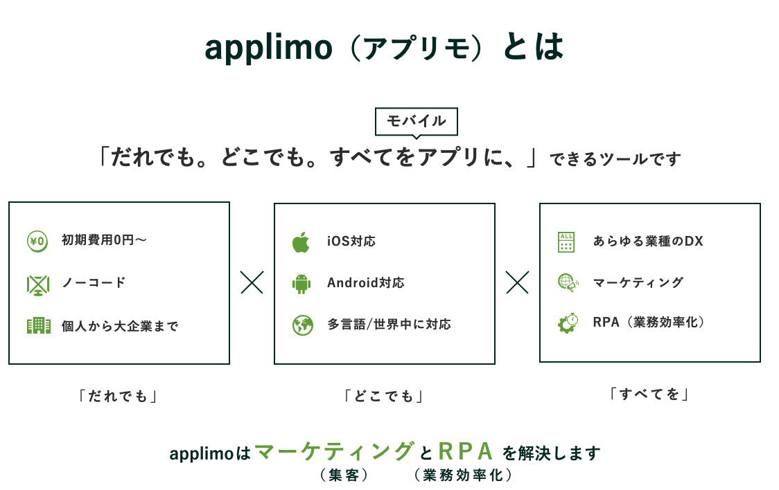 アプリモとは「だれでも、どこでも、すべてをモバイルアプリに」できるツールです。